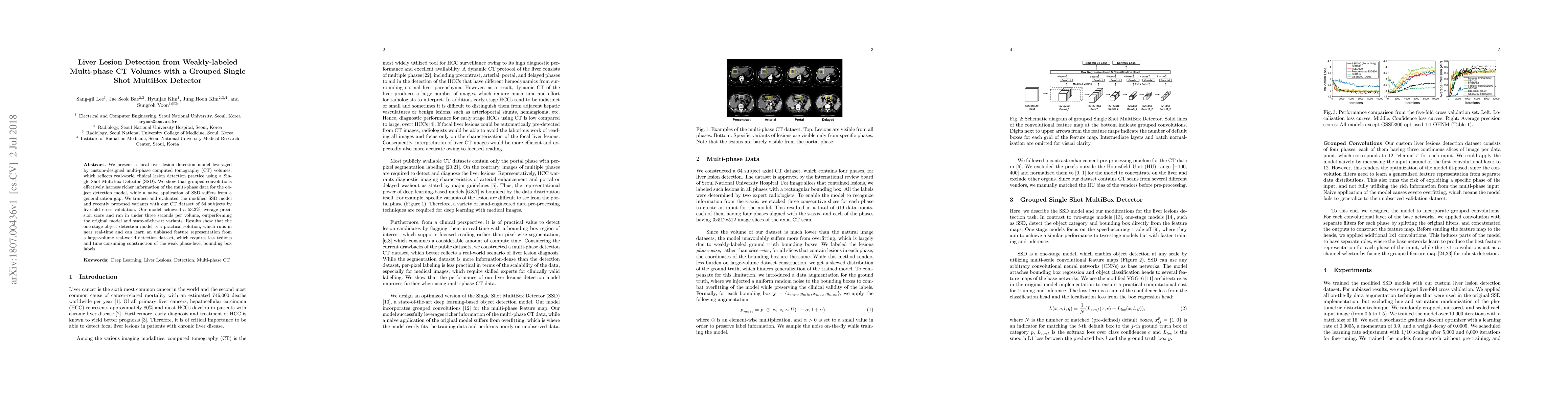 We present a focal liver lesion detection model leveraged by custom-designed multi-phase computed tomography (CT) volumes, which reflects real-world clinical lesion detection practice using a Single Shot MultiBox Detector (SSD). We show that grouped convolutions effectively harness richer information of the multi-phase data for the object detection model, while a naive application of SSD suffers from a generalization gap. We trained and evaluated the modified SSD model and recently proposed variants with our CT dataset of 64 subjects by five-fold cross validation. Our model achieved a 53.3% average precision score and ran in under three seconds per volume, outperforming the original model and state-of-the-art variants. Results show that the one-stage object detection model is a practical solution, which runs in near real-time and can learn an unbiased feature representation from a large-volume real-world detection dataset, which requires less tedious and time consuming construction of the weak phase-level bounding box labels.
