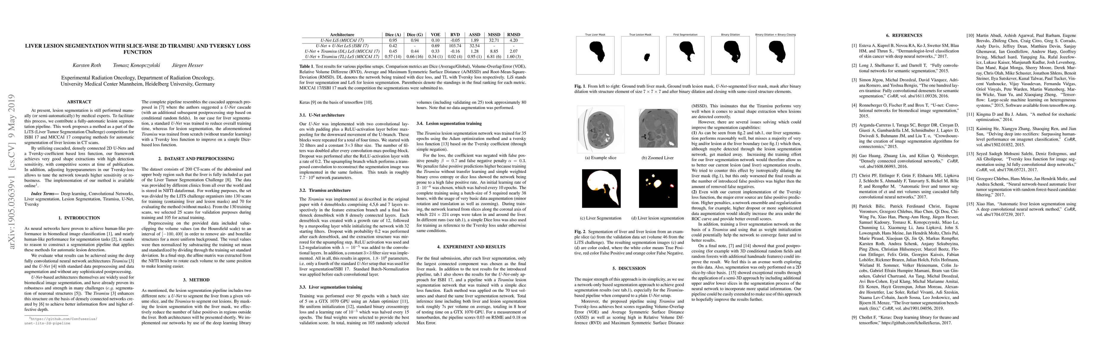 This paper presents a fully-automatic lesion segmentation pipeline using slice-wise 2D Tiramisu and Tversky loss for liver lesion segmentation in CT scans, achieving competitive results in the LiTS competition. The method employs cascaded, densely connected 2D U-Nets and a Tversky-loss function to enhance detection sensitivity and shape extraction.