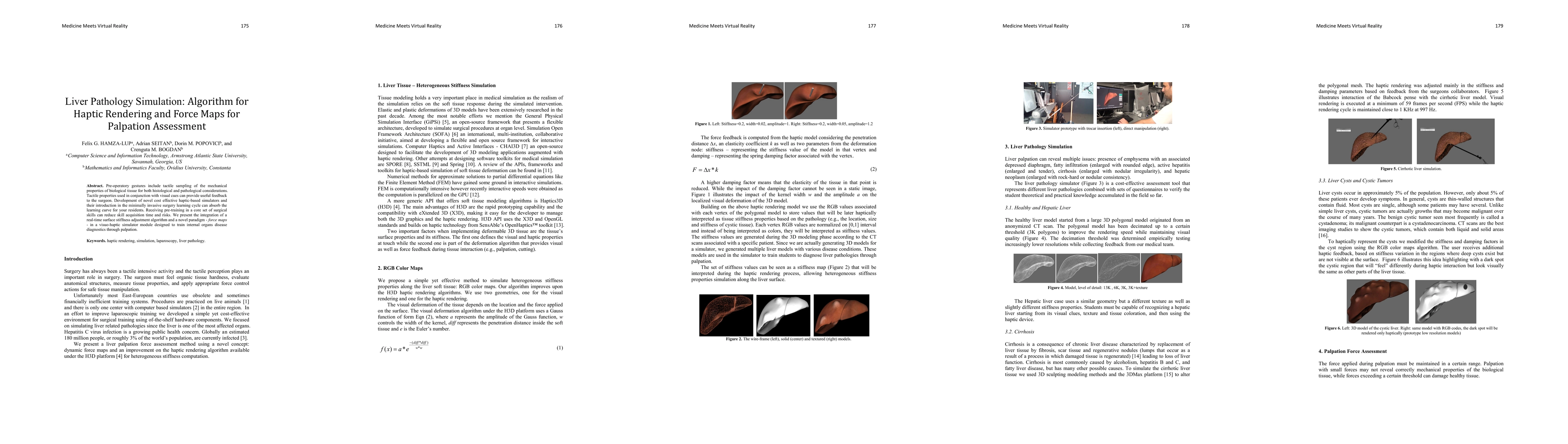 Preoperative gestures include tactile sampling of the mechanical properties of biological tissue for both histological and pathological considerations. Tactile properties used in conjunction with visual cues can provide useful feedback to the surgeon. Development of novel cost effective haptic-based simulators and their introduction in the minimally invasive surgery learning cycle can absorb the learning curve for your residents. Receiving pre-training in a core set of surgical skills can reduce skill acquisition time and risks. We present the integration of a real-time surface stiffness adjustment algorithm and a novel paradigm -- force maps -- in a visuo-haptic simulator module designed to train internal organs disease diagnostics through palpation.