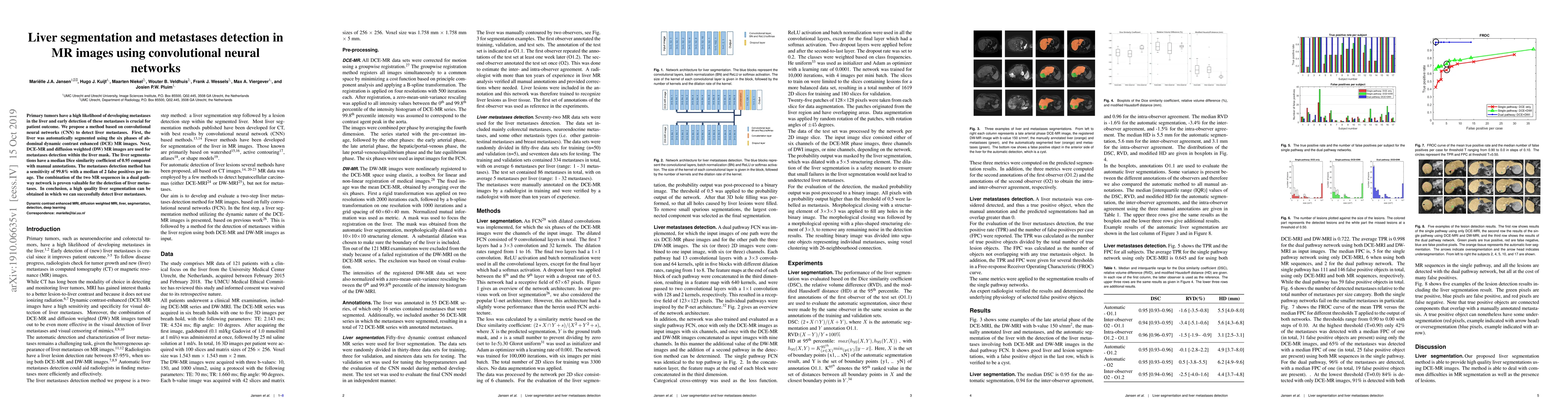 This paper proposes a method using convolutional neural networks (CNN) to automatically segment livers and detect metastases in MR images, achieving a median Dice similarity coefficient of 0.95 and a metastases detection sensitivity of 99.8%, with a dual pathway network combining DCE-MR and DW-MR sequences proving effective.