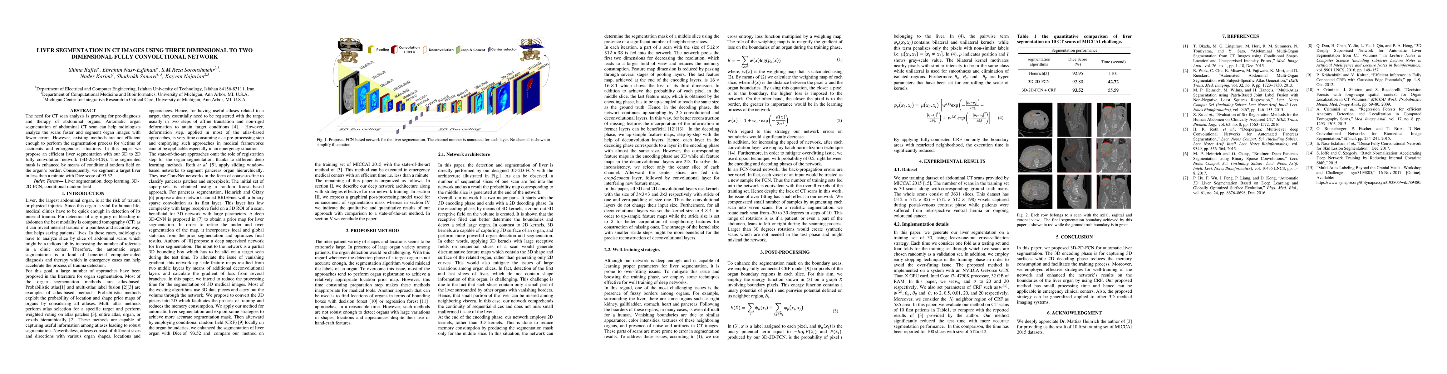 This paper proposes a 3D to 2D fully convolutional network (3D-2D-FCN) for efficient liver segmentation in CT images, which enhances segmented masks using conditional random fields, achieving a Dice score of 93.52 and segmenting the liver in under a minute. This method aims to improve the speed and accuracy of liver segmentation for emergency medical situations.