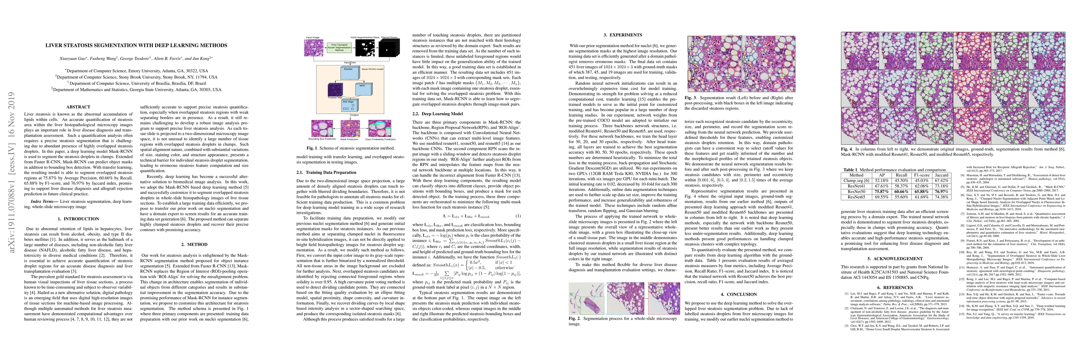 Liver steatosis is known as the abnormal accumulation of lipids within cells. An accurate quantification of steatosis area within the liver histopathological microscopy images plays an important role in liver disease diagnosis and trans-plantation assessment. Such a quantification analysis often requires a precise steatosis segmentation that is challenging due to abundant presence of highly overlapped steatosis droplets. In this paper, a deep learning model Mask-RCNN is used to segment the steatosis droplets in clumps. Extended from Faster R-CNN, Mask-RCNN can predict object masks in addition to bounding box detection. With transfer learning, the resulting model is able to segment overlapped steatosis regions at 75.87% by Average Precision, 60.66% by Recall,65.88% by F1-score, and 76.97% by Jaccard index, promising to support liver disease diagnosis and allograft rejection prediction in future clinical practice.