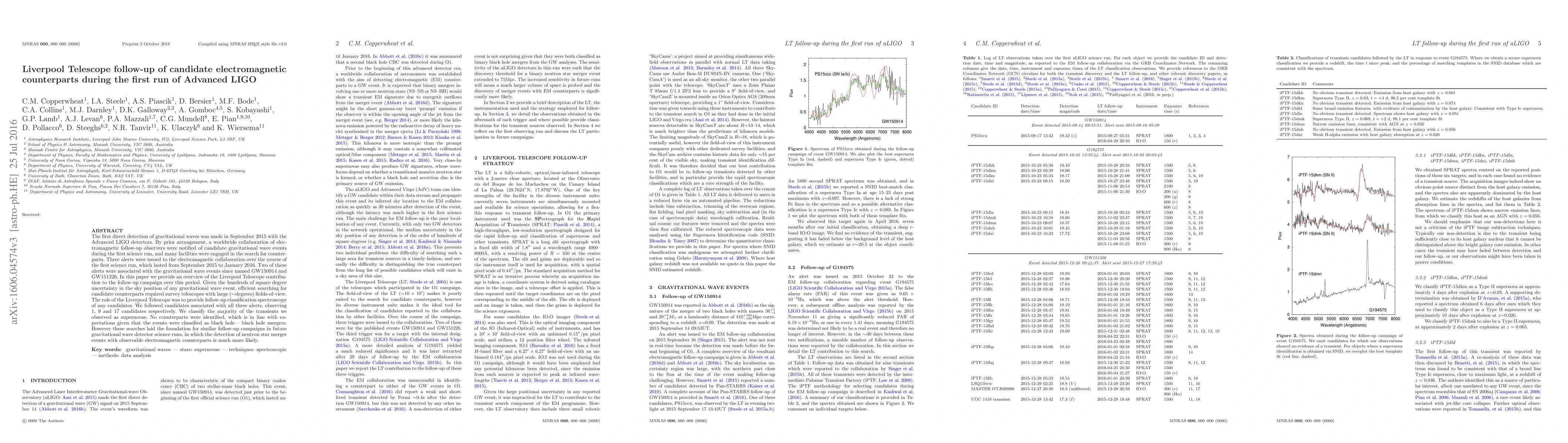 The Liverpool Telescope conducted follow-up observations for candidate electromagnetic counterparts during the first Advanced LIGO gravitational wave detection run, focusing on classification spectroscopy for transient candidates. Despite no counterparts being identified for black hole mergers, the campaign laid the groundwork for future searches, particularly for neutron star mergers.