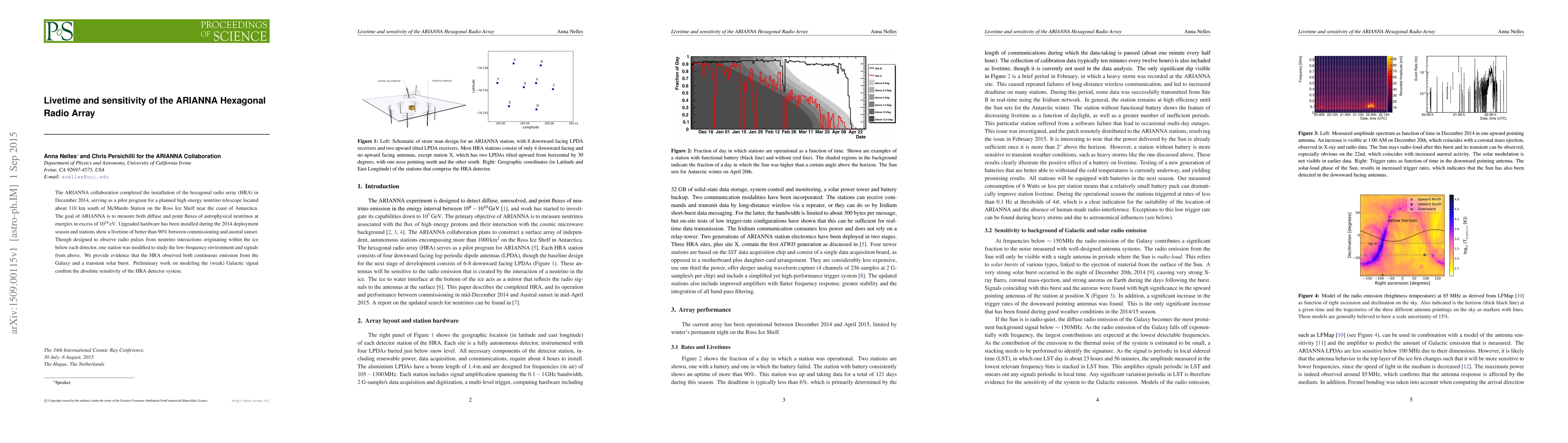 The ARIANNA collaboration completed the installation of the hexagonal radio array (HRA) in December 2014, serving as a pilot program for a planned high energy neutrino telescope located about 110 km south of McMurdo Station on the Ross Ice Shelf near the coast of Antarctica. The goal of ARIANNA is to measure both diffuse and point fluxes of astrophysical neutrinos at energies in excess of 1016 eV. Upgraded hardware has been installed during the 2014 deployment season and stations show a livetime of better than 90% between commissioning and austral sunset. Though designed to observe radio pulses from neutrino interactions originating within the ice below each detector, one station was modified to study the low-frequency environment and signals from above. We provide evidence that the HRA observed both continuous emission from the Galaxy and a transient solar burst. Preliminary work on modeling the (weak) Galactic signal confirm the absolute sensitivity of the HRA detector system.