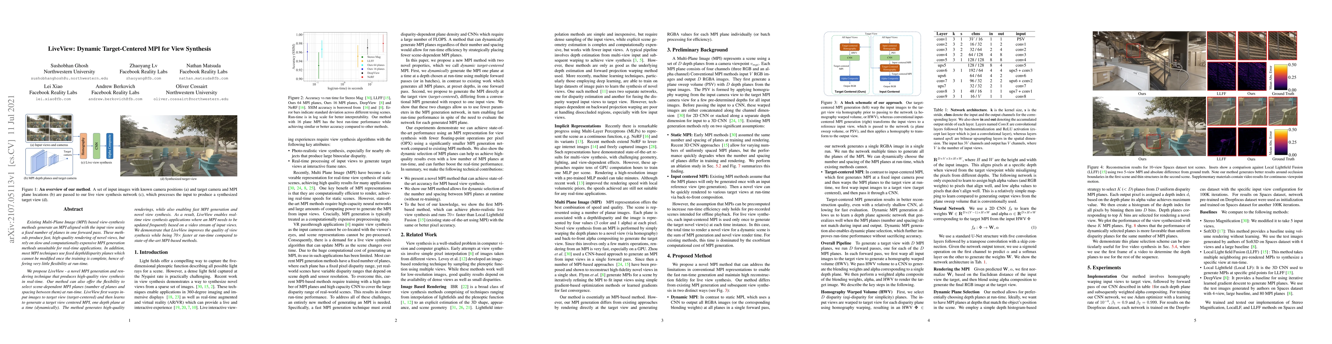Existing Multi-Plane Image (MPI) based view-synthesis methods generate an MPI aligned with the input view using a fixed number of planes in one forward pass. These methods produce fast, high-quality rendering of novel views, but rely on slow and computationally expensive MPI generation methods unsuitable for real-time applications. In addition, most MPI techniques use fixed depth/disparity planes which cannot be modified once the training is complete, hence offering very little flexibility at run-time. We propose LiveView - a novel MPI generation and rendering technique that produces high-quality view synthesis in real-time. Our method can also offer the flexibility to select scene-dependent MPI planes (number of planes and spacing between them) at run-time. LiveView first warps input images to target view (target-centered) and then learns to generate a target view centered MPI, one depth plane at a time (dynamically). The method generates high-quality renderings, while also enabling fast MPI generation and novel view synthesis. As a result, LiveView enables real-time view synthesis applications where an MPI needs to be updated frequently based on a video stream of input views. We demonstrate that LiveView improves the quality of view synthesis while being 70 times faster at run-time compared to state-of-the-art MPI-based methods.