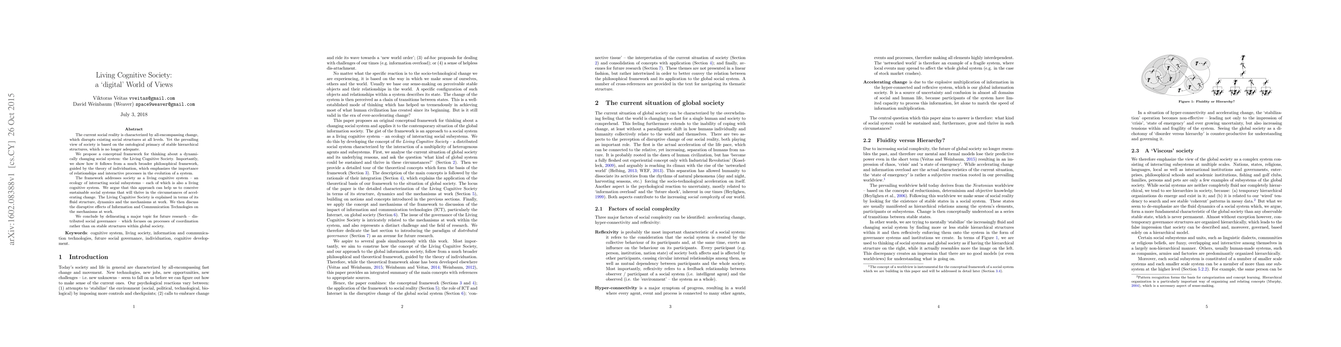 The paper proposes the Living Cognitive Society framework to conceptualize a dynamically changing social system, emphasizing relationships and interactive processes over stable structures. It highlights the disruptive effects of Information and Communication Technologies and suggests distributed social governance as a future research focus.