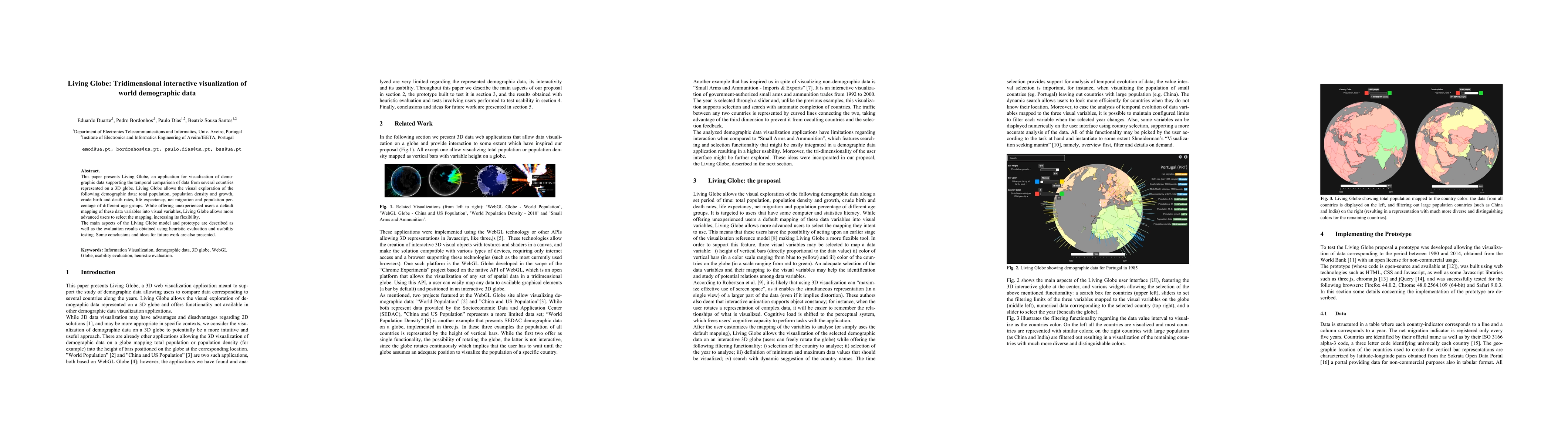 Living Globe is a 3D interactive visualization application for comparing demographic data across countries over time. It supports detailed exploration of population metrics and allows user customization for advanced mappings, with positive evaluation results from heuristic and usability tests.