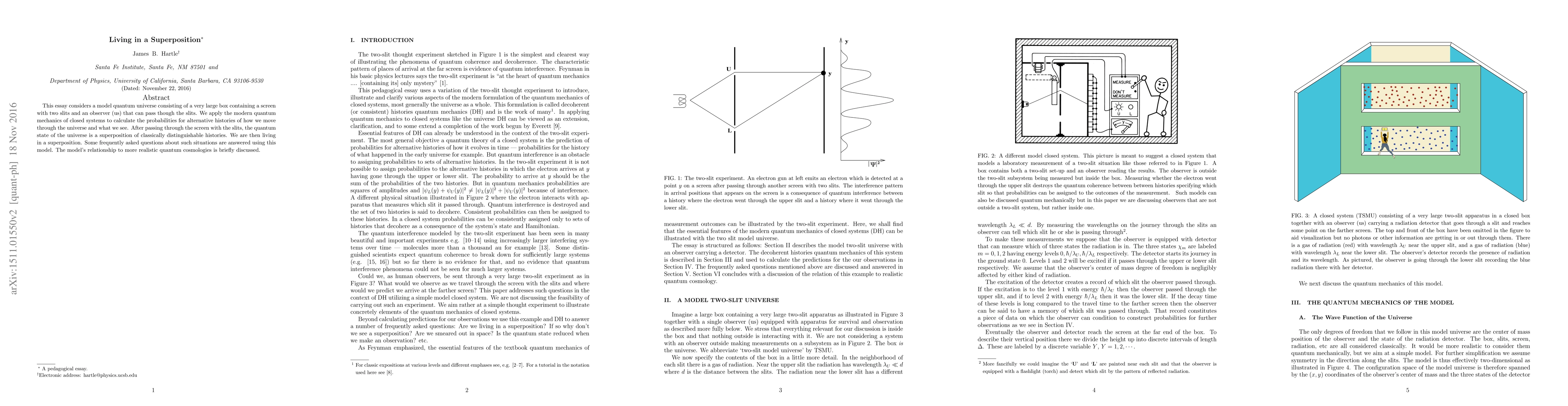 This essay considers a model quantum universe consisting of a very large box containing a screen with two slits and an observer (us) that can pass though the slits. We apply the modern quantum mechanics of closed systems to calculate the probabilities for alternative histories of how we move through the universe and what we see. After passing through the screen with the slits, the quantum state of the universe is a superposition of classically distinguishable histories. We are then living in a superposition. Some frequently asked questions about such situations are answered using this model. The model's relationship to more realistic quantum cosmologies is briefly discussed.