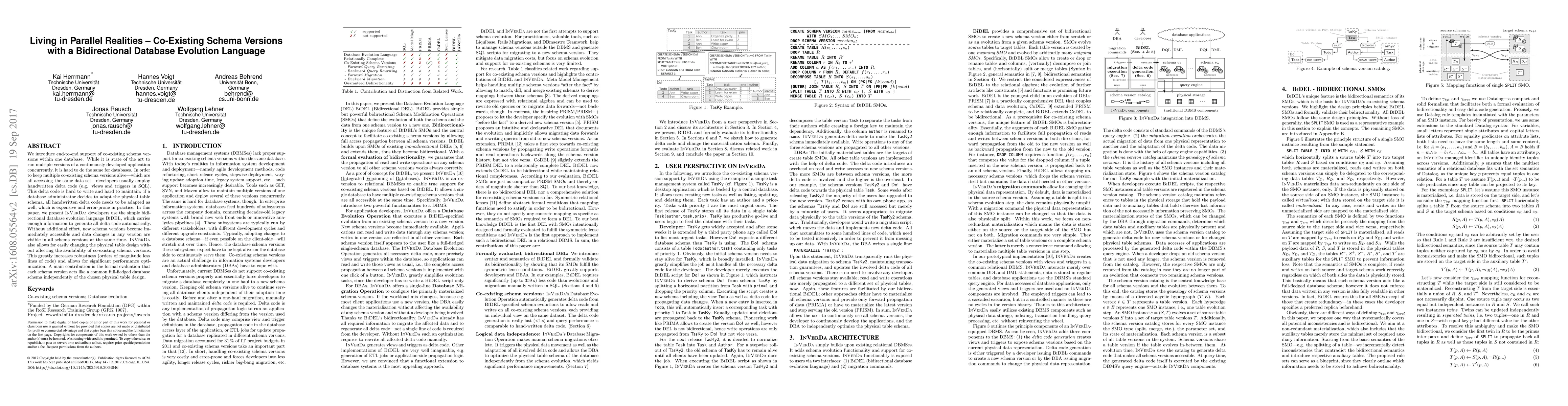 We introduce end-to-end support of co-existing schema versions within one database. While it is state of the art to run multiple versions of a continuously developed application concurrently, it is hard to do the same for databases. In order to keep multiple co-existing schema versions alive; which are all accessing the same data set; developers usually employ handwritten delta code (e.g. views and triggers in SQL). This delta code is hard to write and hard to maintain: if a database administrator decides to adapt the physical table schema, all handwritten delta code needs to be adapted as well, which is expensive and error-prone in practice. In this paper, we present InVerDa: developers use the simple bidirectional database evolution language BiDEL, which carries enough information to generate all delta code automatically. Without additional effort, new schema versions become immediately accessible and data changes in any version are visible in all schema versions at the same time. InVerDa also allows for easily changing the physical table design without affecting the availability of co-existing schema versions. This greatly increases robustness (orders of magnitude less lines of code) and allows for significant performance optimization. A main contribution is the formal evaluation that each schema version acts like a common full-fledged database schema independently of the chosen physical table design.