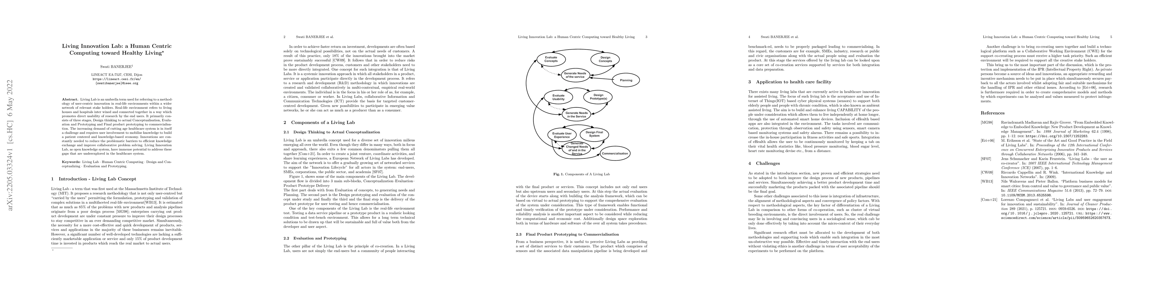 Living Lab is an umbrella term used for referring to a methodology of user-centric innovation in real-life environments within a wider network of relevant stake holders. Real-life environment refers to living houses and hospitals inter wined and connected together in a way which promotes direct usability of research by the end users. It primarily consists of three stages, Design thinking to actual Conceptualisation, Evaluation and Prototyping and Final product prototyping to commercialisation. The increasing demand of cutting age healthcare system is in itself a challenge and requires user involvement to mobilise knowledge to build a patient centered and knowledge-based economy. Innovations are constantly needed to reduce the problematic barriers to efficient knowledge exchange and improve collaborative problem solving. Living Innovation Lab, as open knowledge system, have immense potential to address these gaps that are underexplored in the healthcare system.