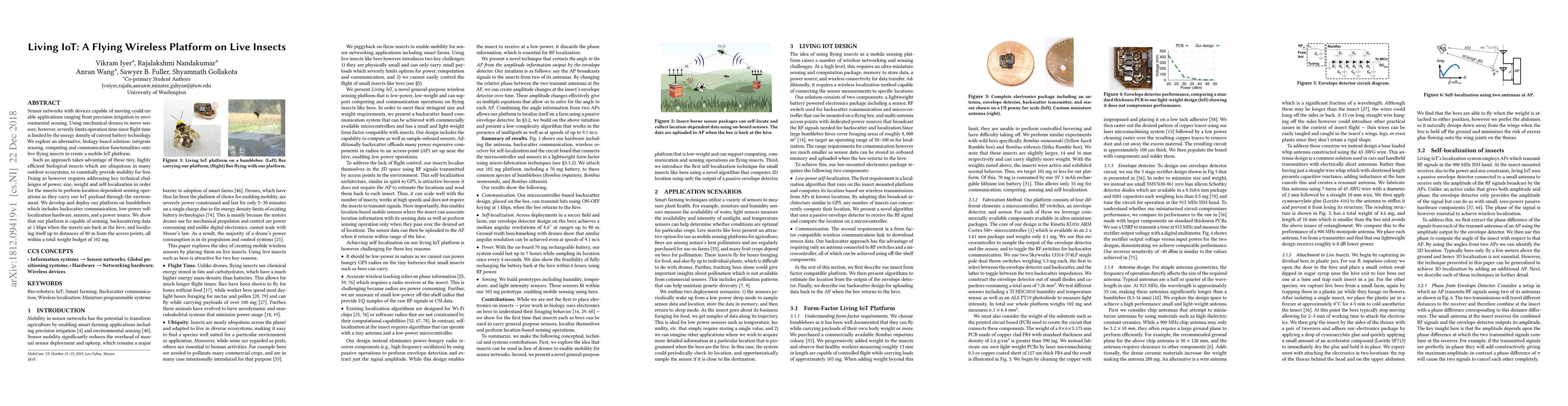 This research explores integrating sensing and communication functionalities onto live bumblebees to create a mobile IoT platform, leveraging the insects' natural mobility. The platform addresses challenges in power, size, and weight, enabling the insects to perform location-dependent sensing and localize themselves up to 80 meters from access points.