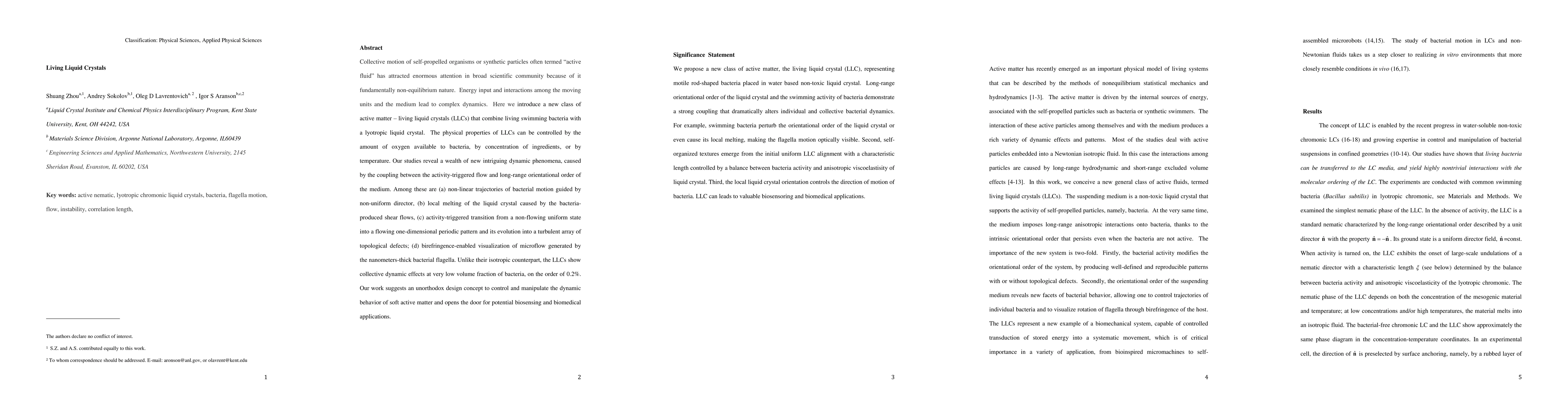 Collective motion of self-propelled organisms or synthetic particles often termed active fluid has attracted enormous attention in broad scientific community because of it fundamentally non-equilibrium nature. Energy input and interactions among the moving units and the medium lead to complex dynamics. Here we introduce a new class of active matter, living liquid crystals (LLCs) that combine living swimming bacteria with a lyotropic liquid crystal. The physical properties of LLCs can be controlled by the amount of oxygen available to bacteria, by concentration of ingredients, or by temperature. Our studies reveal a wealth of new intriguing dynamic phenomena, caused by the coupling between the activity-triggered flow and long-range orientational order of the medium. Among these are (a) non-linear trajectories of bacterial motion guided by non-uniform director, (b) local melting of the liquid crystal caused by the bacteria-produced shear flows, (c) activity-triggered transition from a non-flowing uniform state into a flowing one-dimensional periodic pattern and its evolution into a turbulent array of topological defects, (d) birefringence-enabled visualization of microflow generated by the nanometers-thick bacterial flagella. Unlike their isotropic counterpart, the LLCs show collective dynamic effects at very low volume fraction of bacteria, on the order of 0.2%. Our work suggests an unorthodox design concept to control and manipulate the dynamic behavior of soft active matter and opens the door for potential biosensing and biomedical applications.