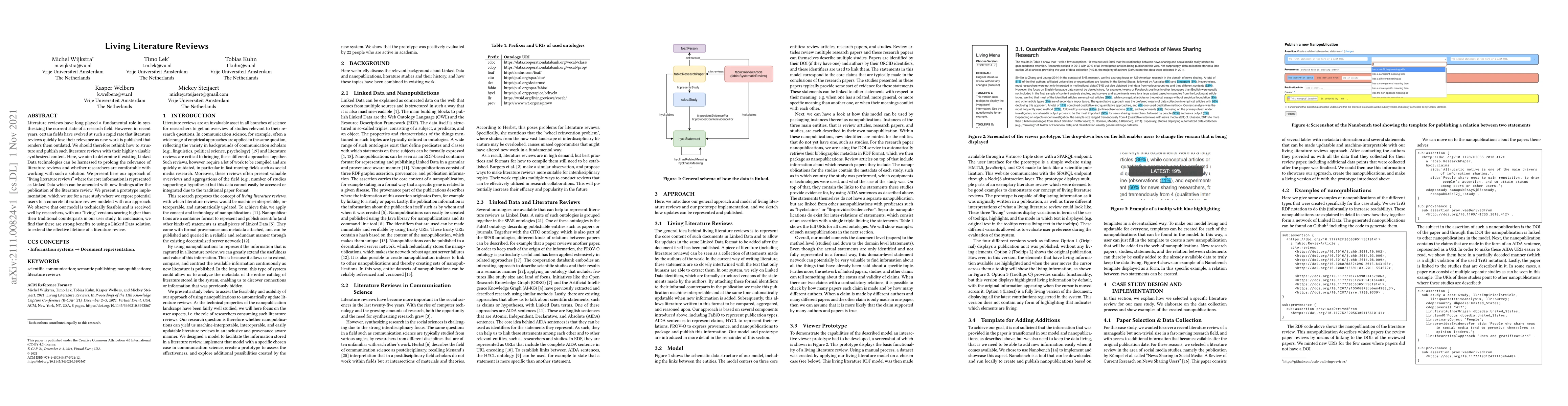 This paper proposes "living literature reviews" using Linked Data to maintain relevance by continuously updating synthesized content. The study finds that this approach is technically feasible and better received by researchers compared to traditional static reviews.