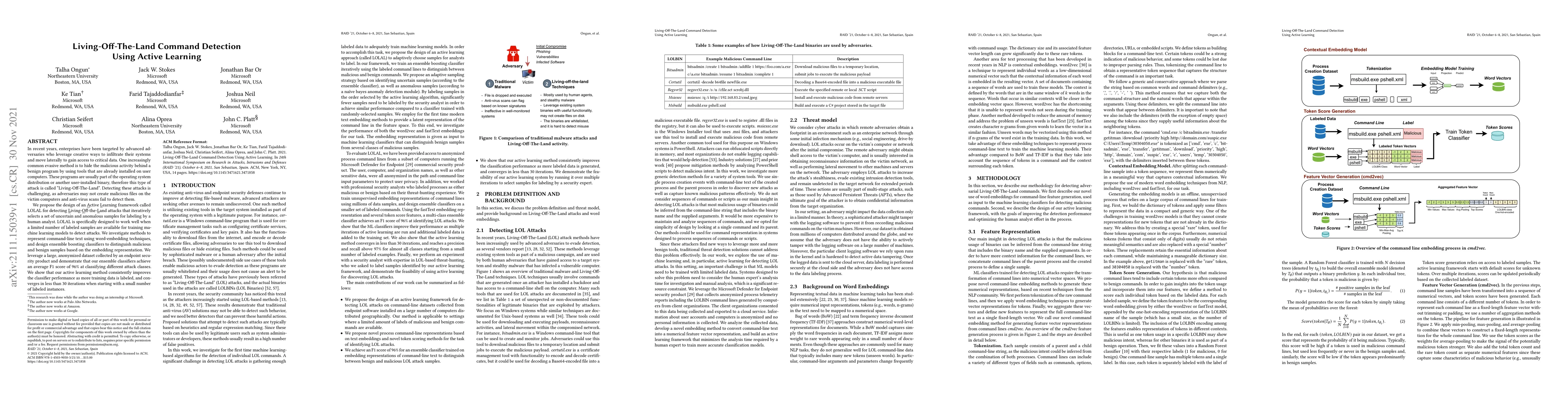 This paper proposes an Active Learning framework named LOLAL to detect "Living-Off-The-Land" attacks, which use benign programs to hide malicious activities. The framework iteratively selects uncertain samples for human labeling and employs ensemble boosting classifiers with word-embedding techniques to distinguish between malicious and benign commands. The approach demonstrates high classification accuracy and improves performance with additional labeled data.