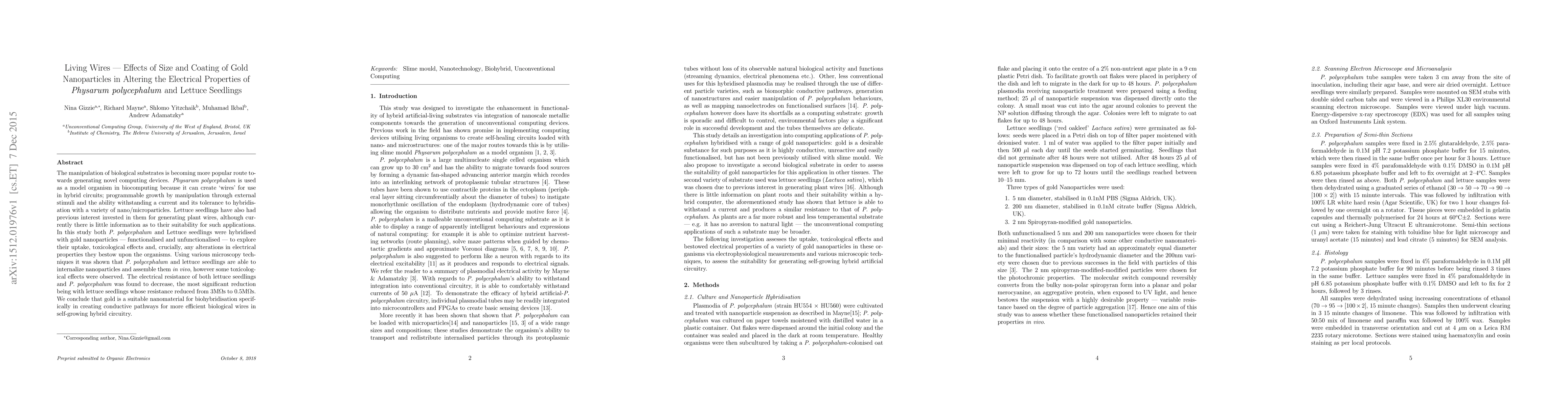 The manipulation of biological substrates is becoming more popular route towards generating novel computing devices. Physarum polycephalum is used as a model organism in biocomputing because it can create `wires' for use in hybrid circuits; programmable growth by manipulation through external stimuli and the ability withstanding a current and its tolerance to hybridisation with a variety of nano/microparticles. Lettuce seedlings have also had previous interest invested in them for generating plant wires, although currently there is little information as to their suitability for such applications. In this study both P. polycephalum and Lettuce seedlings were hybridised with gold nanoparticles - functionalised and unfunctionalised - to explore their uptake, toxicological effects and, crucially, any alterations in electrical properties they bestow upon the organisms. Using various microscopy techniques it was shown that P. polycephalum and lettuce seedlings are able to internalize nanoparticles and assemble them in vivo, however some toxicological effects were observed. The electrical resistance of both lettuce seedlings and P. polycephalum was found to decrease, the most significant reduction being with lettuce seedlings whose resistance reduced from 3MOhms to 0.5MOhms. We conclude that gold is a suitable nanomaterial for biohybridisation specifically in creating conductive pathways for more efficient biological wires in self-growing hybrid circuitry.