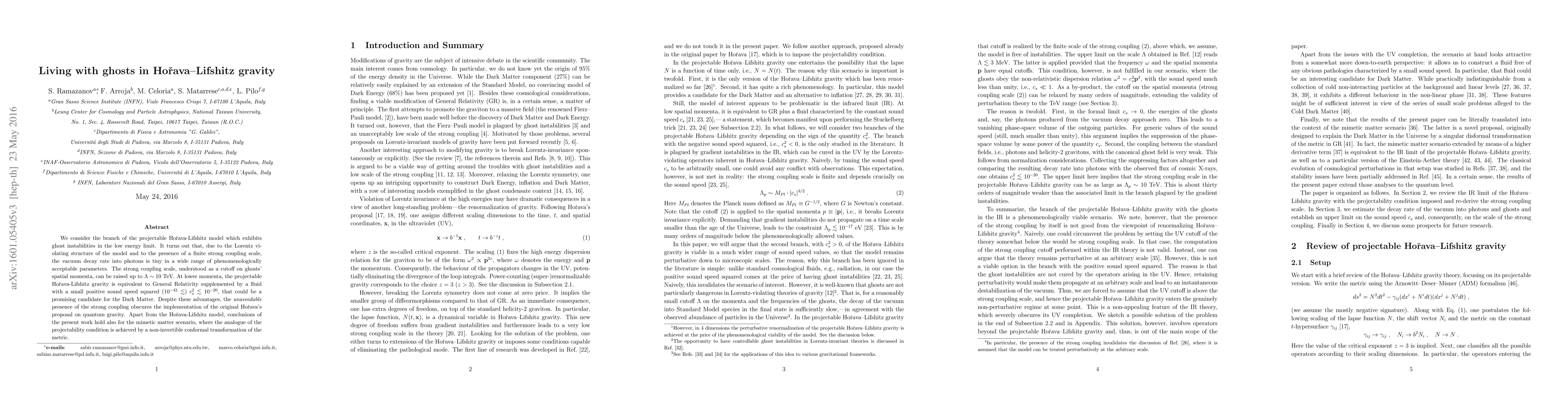 We consider the branch of the projectable Horava-Lifshitz model which exhibits ghost instabilities in the low energy limit. It turns out that, due to the Lorentz violating structure of the model and to the presence of a finite strong coupling scale, the vacuum decay rate into photons is tiny in a wide range of phenomenologically acceptable parameters. The strong coupling scale, understood as a cutoff on ghosts' spatial momenta, can be raised up to $\Lambda \sim 10$ TeV. At lower momenta, the projectable Horava-Lifshitz gravity is equivalent to General Relativity supplemented by a fluid with a small positive sound speed squared ($10^{-42}\lesssim$) $c^2_s \lesssim 10^{-20}$, that could be a promising candidate for the Dark Matter. Despite these advantages, the unavoidable presence of the strong coupling obscures the implementation of the original Horava's proposal on quantum gravity. Apart from the Horava-Lifshitz model, conclusions of the present work hold also for the mimetic matter scenario, where the analogue of the projectability condition is achieved by a non-invertible conformal transformation of the metric.