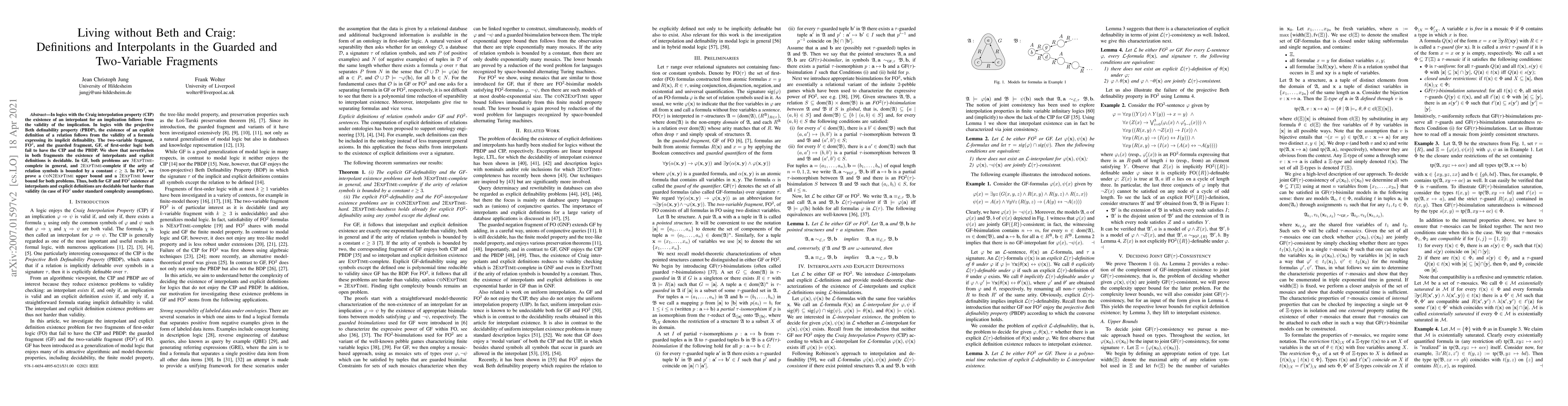 This paper investigates the decidability of interpolation and explicit definitions in the guarded fragment (GF) and the two-variable fragment (FO2) of first-order logic, despite their lack of Craig interpolation and projective Beth properties. It finds that both problems are computationally complex, with specific complexity bounds for GF and FO2.