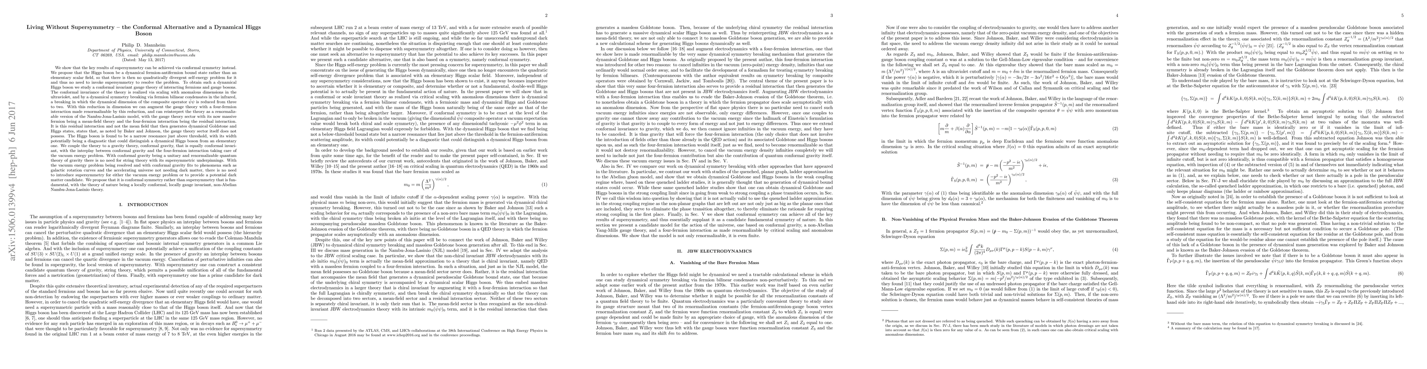 This paper proposes that conformal symmetry can replace supersymmetry in achieving key results, suggesting a dynamical Higgs boson as a solution to the quadratic divergence problem. It introduces a renormalizable 4-fermion interaction within a conformal invariant theory, generating dynamical Higgs states without invoking supersymmetry, and uses conformal gravity to address the vacuum energy problem.