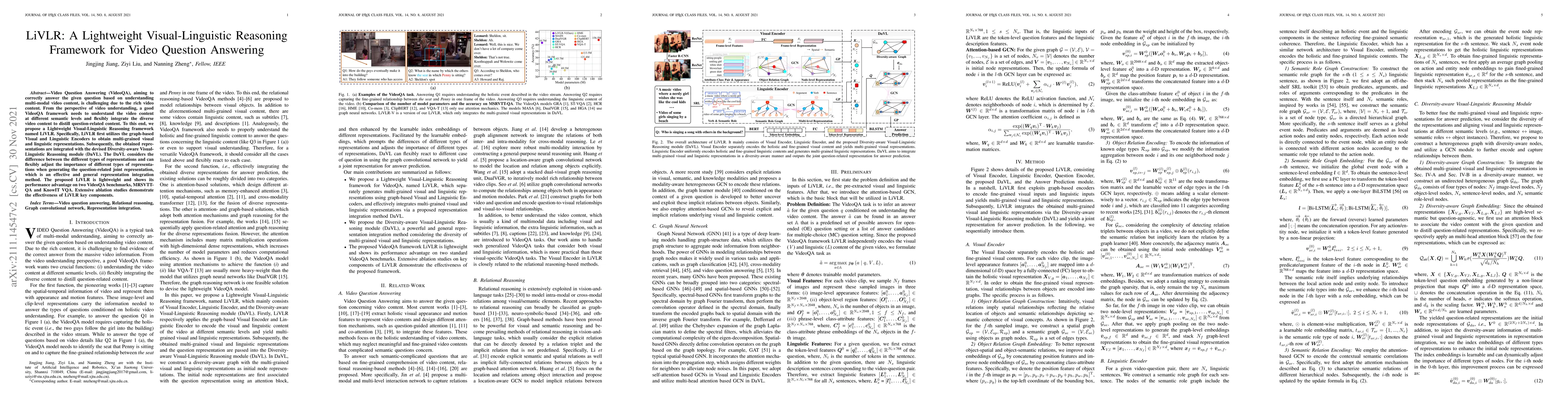 LiVLR is a proposed lightweight framework for Video Question Answering that employs graph-based Visual and Linguistic Encoders to extract multi-grained representations, which are then integrated via a Diversity-aware Visual-Linguistic Reasoning module to generate effective joint representations. The framework demonstrates superior performance on MRSVTT-QA and KnowIT VQA benchmarks.