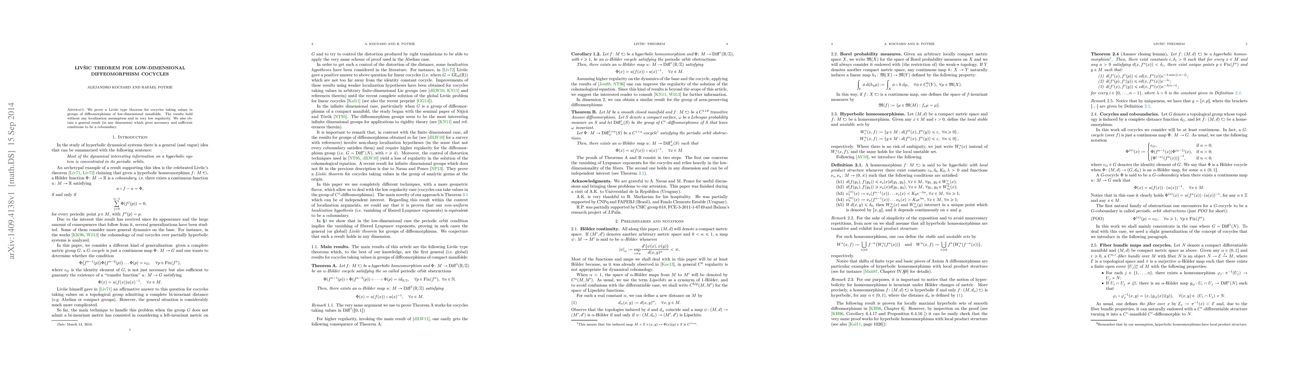 We prove a Livsic type theorem for cocycles taking values in groups of diffeomorphisms of low-dimensional manifolds. The results hold without any localization assumption and in very low regularity. We also obtain a general result (in any dimension) which gives necessary and sufficient conditions to be a coboundary.