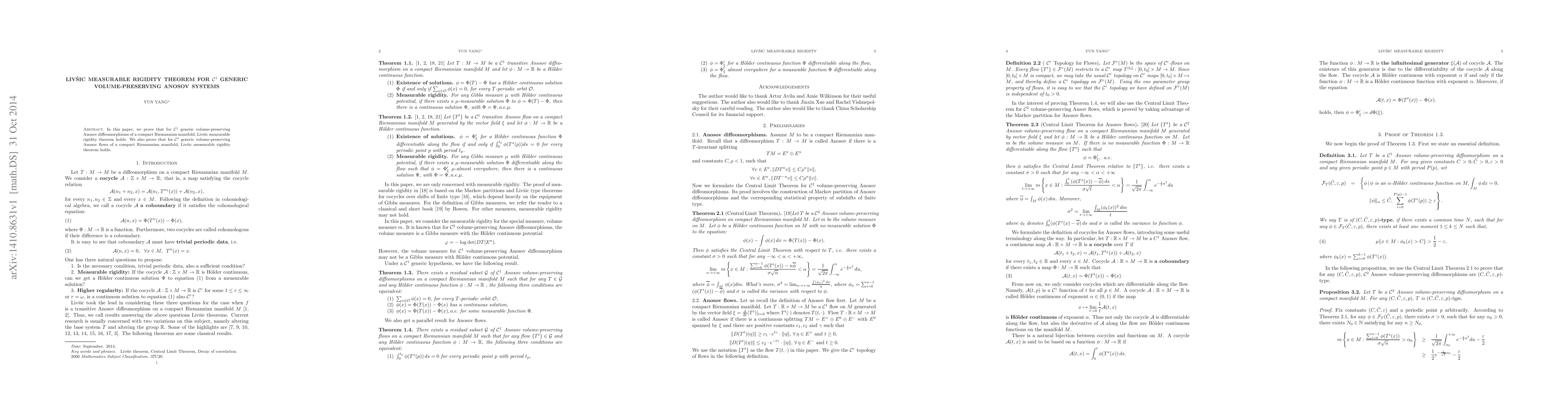 In this paper, we prove that for $\mathcal{C}^1$ generic volume-preserving Anosov diffeomorphisms of a compact Riemannian manifold, Liv\v{s}ic measurable rigidity theorem holds. We also prove that for $\mathcal{C}^1$ generic volume-preserving Anosov flows of a compact Riemannian manifold, Liv\v{s}ic measurable rigidity theorem holds.
