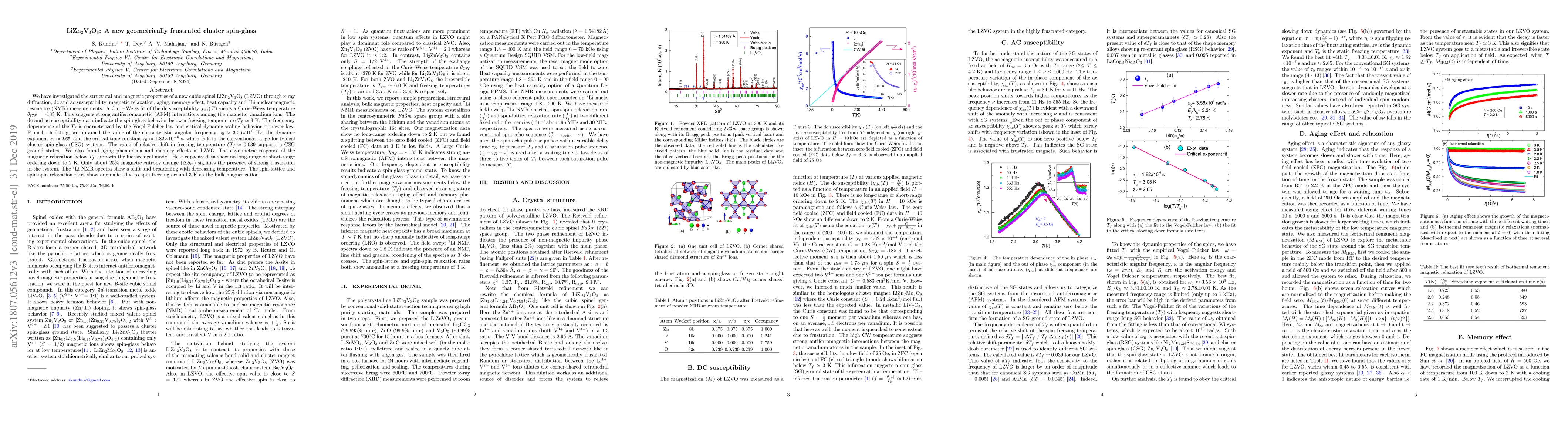 We have investigated the structural and magnetic properties of a new cubic spinel LiZn$_{2}$V$_{3}$O$_{8}$ (LZVO) through x-ray diffraction, dc and ac susceptibility, magnetic relaxation, aging, memory effect, heat capacity and $^{7}$Li nuclear magnetic resonance (NMR) measurements. A Curie-Weiss fit of the dc susceptibility $\chi_{\mathrm{dc}}$($\mathit{T}$) yields a Curie-Weiss temperature $\mathrm{\theta}_{\mathrm{CW}}$ = -185 K. This suggests strong antiferromagnetic (AFM) interactions among the magnetic vanadium ions. The dc and ac susceptibility data indicate the spin-glass behavior below a freezing temperature $T_{f}$ $\simeq$ 3 K. The frequency dependence of the $T_{f}$ is characterized by the Vogel-Fulcher law and critical dynamic scaling behavior or power law. From both fitting, we obtained the value of the characteristic angular frequency $\omega_{0}$ $\approx$ 3.56$\times$10$^{6}$ Hz, the dynamic exponent $\mathit{zv}$ $\approx$ 2.65, and the critical time constant $\tau_{0}$ $\approx$ 1.82$\times$10$^{-6}$ s, which falls in the conventional range for typical cluster spin-glass (CSG) systems. The value of relative shift in freezing temperature $\delta T_{f}$ $\simeq$ 0.039 supports a CSG ground states. We also found aging phenomena and memory effects in LZVO. The asymmetric response of the magnetic relaxation below $T_{f}$ supports the hierarchical model. Heat capacity data show no long-range or short-range ordering down to 2 K. Only about 25% magnetic entropy change $(\Delta S_{\mathrm{m}})$ signifies the presence of strong frustration in the system. The $^{7}$Li NMR spectra show a shift and broadening with decreasing temperature. The spin-lattice and spin-spin relaxation rates show anomalies due to spin freezing around 3 K as the bulk magnetization.