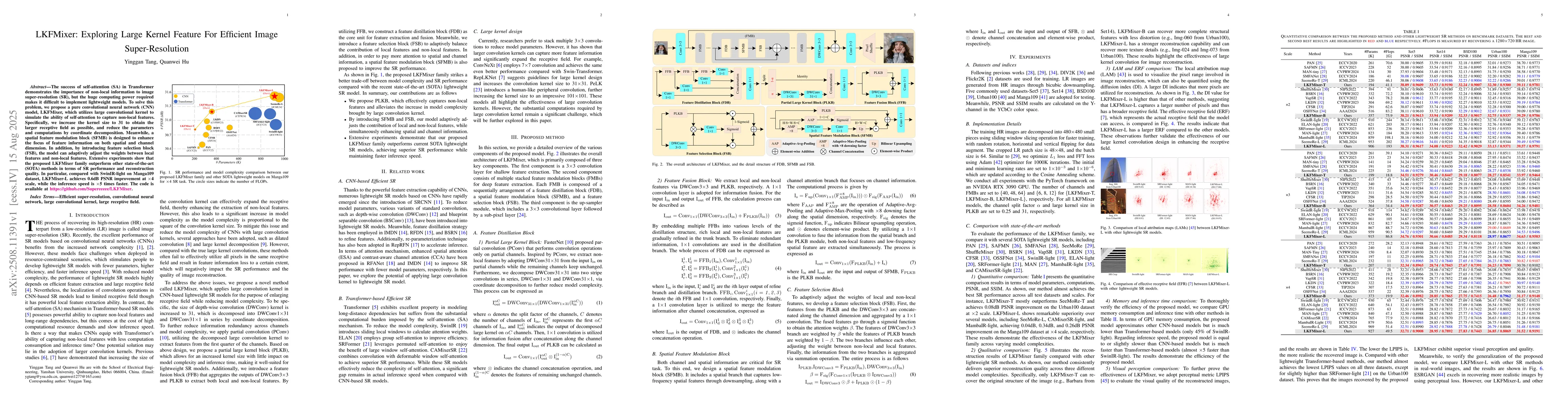 The success of self-attention (SA) in Transformer demonstrates the importance of non-local information to image super-resolution (SR), but the huge computing power required makes it difficult to implement lightweight models. To solve this problem, we propose a pure convolutional neural network (CNN) model, LKFMixer, which utilizes large convolutional kernel to simulate the ability of self-attention to capture non-local features. Specifically, we increase the kernel size to 31 to obtain the larger receptive field as possible, and reduce the parameters and computations by coordinate decomposition. Meanwhile, a spatial feature modulation block (SFMB) is designed to enhance the focus of feature information on both spatial and channel dimension. In addition, by introducing feature selection block (FSB), the model can adaptively adjust the weights between local features and non-local features. Extensive experiments show that the proposed LKFMixer family outperform other state-of-the-art (SOTA) methods in terms of SR performance and reconstruction quality. In particular, compared with SwinIR-light on Manga109 dataset, LKFMixer-L achieves 0.6dB PSNR improvement at $\times$4 scale, while the inference speed is $\times$5 times faster. The code is available at https://github.com/Supereeeee/LKFMixer.