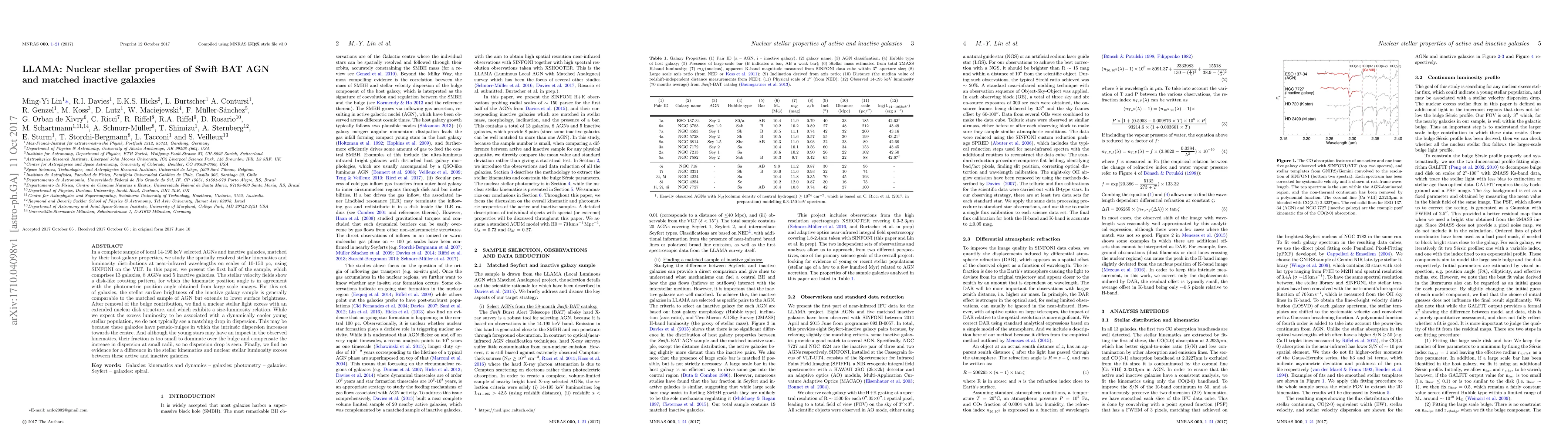 In a complete sample of local 14-195 keV selected AGNs and inactive galaxies, matched by their host galaxy properties, we study the spatially resolved stellar kinematics and luminosity distributions at near-infrared wavelengths on scales of 10-150 pc, using SINFONI on the VLT. In this paper, we present the first half of the sample, which comprises 13 galaxies, 8 AGNs and 5 inactive galaxies. The stellar velocity fields show a disk-like rotating pattern, for which the kinematic position angle is in agreement with the photometric position angle obtained from large scale images. For this set of galaxies, the stellar surface brightness of the inactive galaxy sample is generally comparable to the matched sample of AGN but extends to lower surface brightness. After removal of the bulge contribution, we find a nuclear stellar light excess with an extended nuclear disk structure, and which exhibits a size-luminosity relation. While we expect the excess luminosity to be associated with a dynamically cooler young stellar population, we do not typically see a matching drop in dispersion. This may be because these galaxies have pseudo-bulges in which the intrinsic dispersion increases towards the centre. And although the young stars may have an impact in the observed kinematics, their fraction is too small to dominate over the bulge and compensate the increase in dispersion at small radii, so no dispersion drop is seen. Finally, we find no evidence for a difference in the stellar kinematics and nuclear stellar luminosity excess between these active and inactive galaxies.
