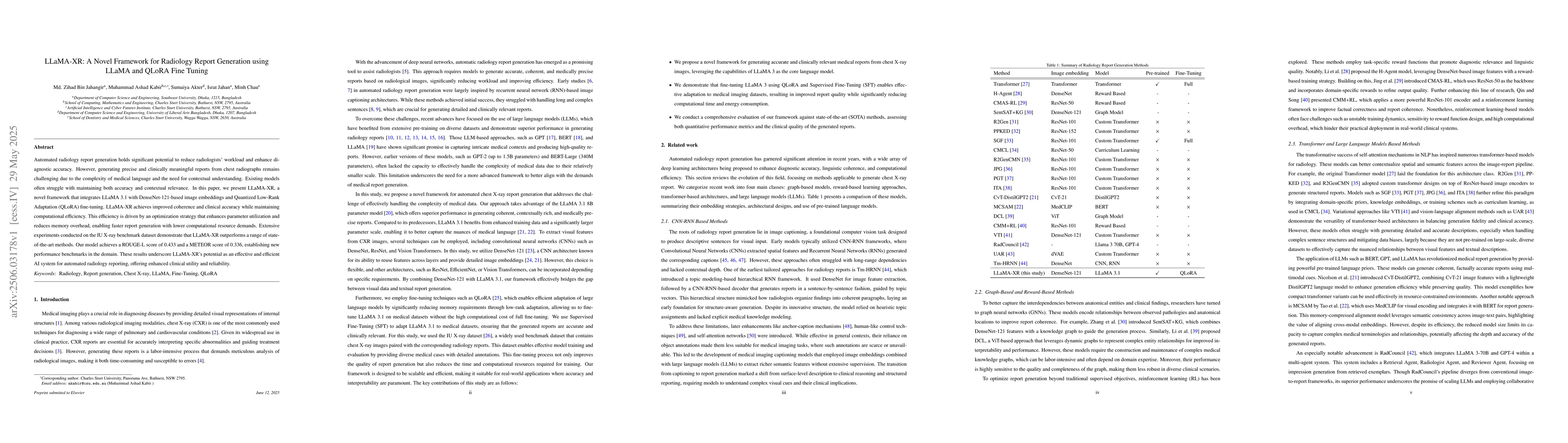 The paper introduces LLaMA-XR, a framework that combines LLaMA 3.1 language model with DenseNet-121 for image embeddings, and employs QLoRA fine-tuning to optimize computational efficiency while maintaining clinical accuracy in radiology report generation.