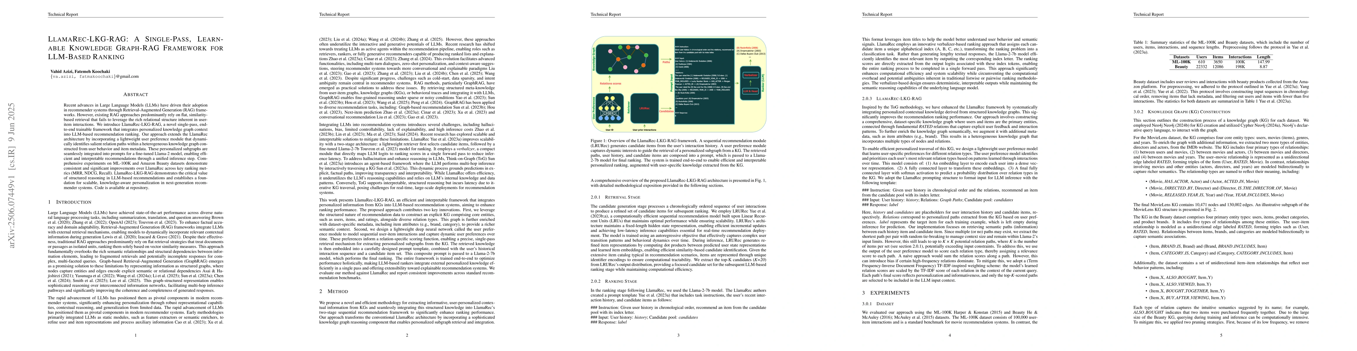 LlamaRec-LKG-RAG introduces a novel single-pass, end-to-end trainable framework that leverages structured knowledge graph context and personalized user preferences for LLM-based recommendation ranking, outperforming existing approaches on standard recommendation metrics.