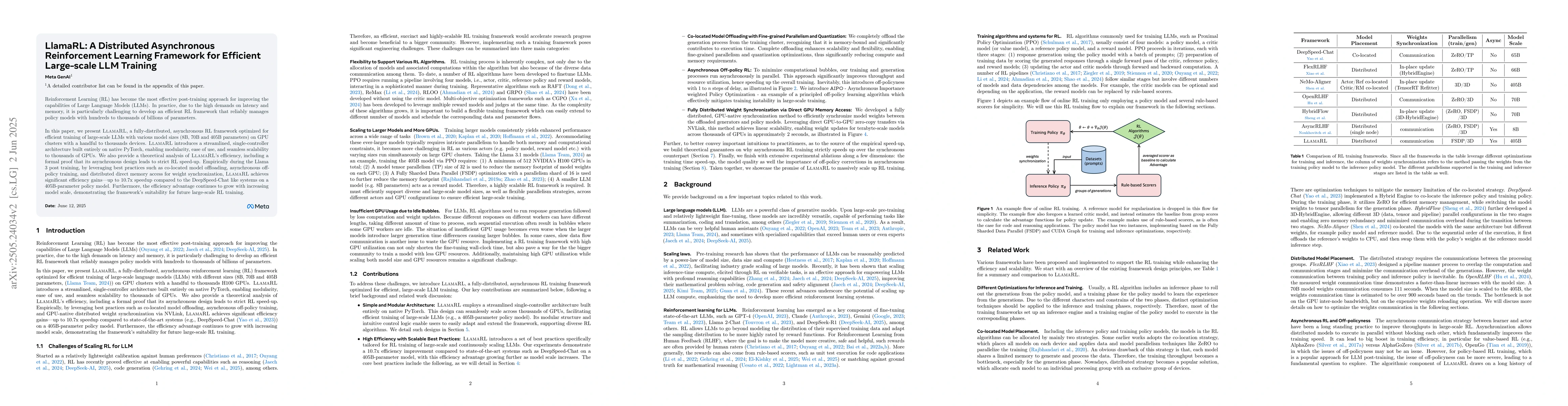 LlamaRL is a distributed asynchronous reinforcement learning framework that improves efficiency in training large language models with hundreds of billions of parameters. It achieves up to 10.7x speed-up on a 405B-parameter model, making it suitable for future large-scale RL training.