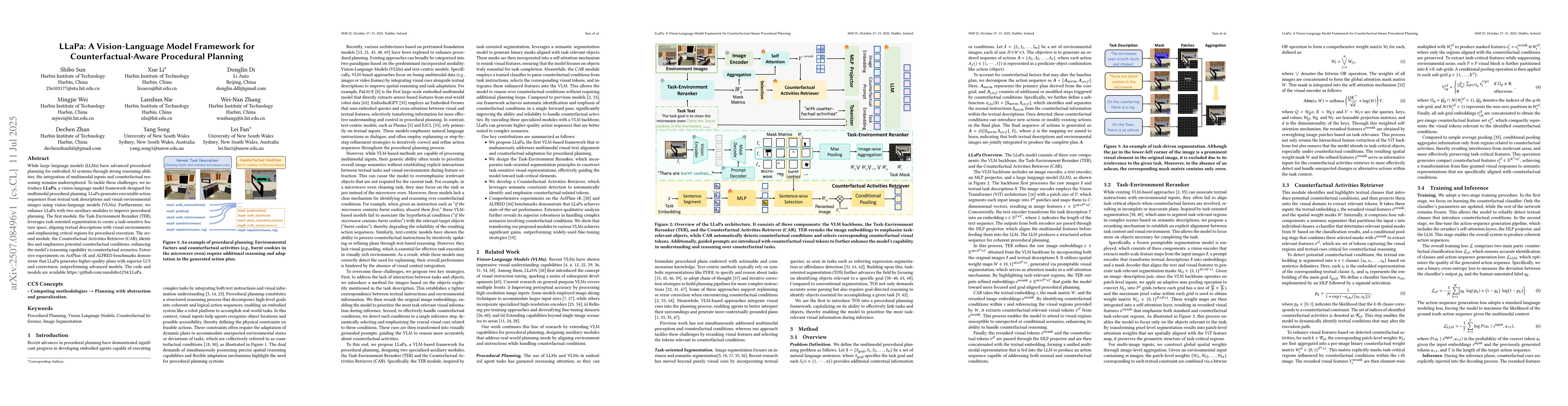 While large language models (LLMs) have advanced procedural planning for embodied AI systems through strong reasoning abilities, the integration of multimodal inputs and counterfactual reasoning remains underexplored. To tackle these challenges, we introduce LLaPa, a vision-language model framework designed for multimodal procedural planning. LLaPa generates executable action sequences from textual task descriptions and visual environmental images using vision-language models (VLMs). Furthermore, we enhance LLaPa with two auxiliary modules to improve procedural planning. The first module, the Task-Environment Reranker (TER), leverages task-oriented segmentation to create a task-sensitive feature space, aligning textual descriptions with visual environments and emphasizing critical regions for procedural execution. The second module, the Counterfactual Activities Retriever (CAR), identifies and emphasizes potential counterfactual conditions, enhancing the model's reasoning capability in counterfactual scenarios. Extensive experiments on ActPlan-1K and ALFRED benchmarks demonstrate that LLaPa generates higher-quality plans with superior LCS and correctness, outperforming advanced models. The code and models are available https://github.com/sunshibo1234/LLaPa.