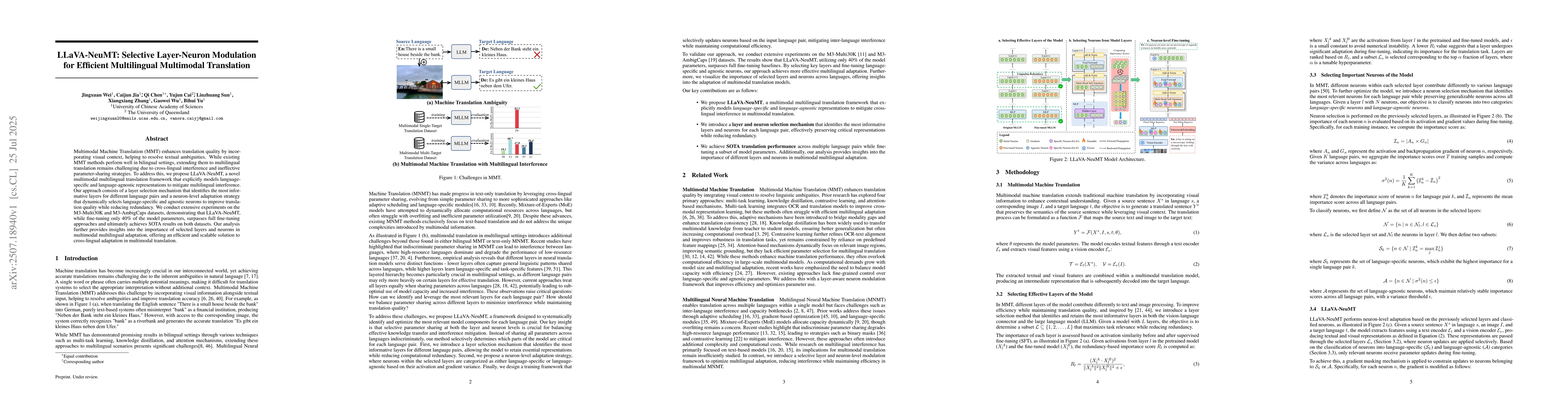 The paper introduces LLaVA-NeuMT, a framework that improves multilingual multimodal translation by selecting relevant layers and neurons for different language pairs. This approach reduces redundancy, enhances translation quality, and outperforms full fine-tuning methods on M3-Multi30K and M3-AmbigCaps datasets, while fine-tuning only 40% of model parameters.