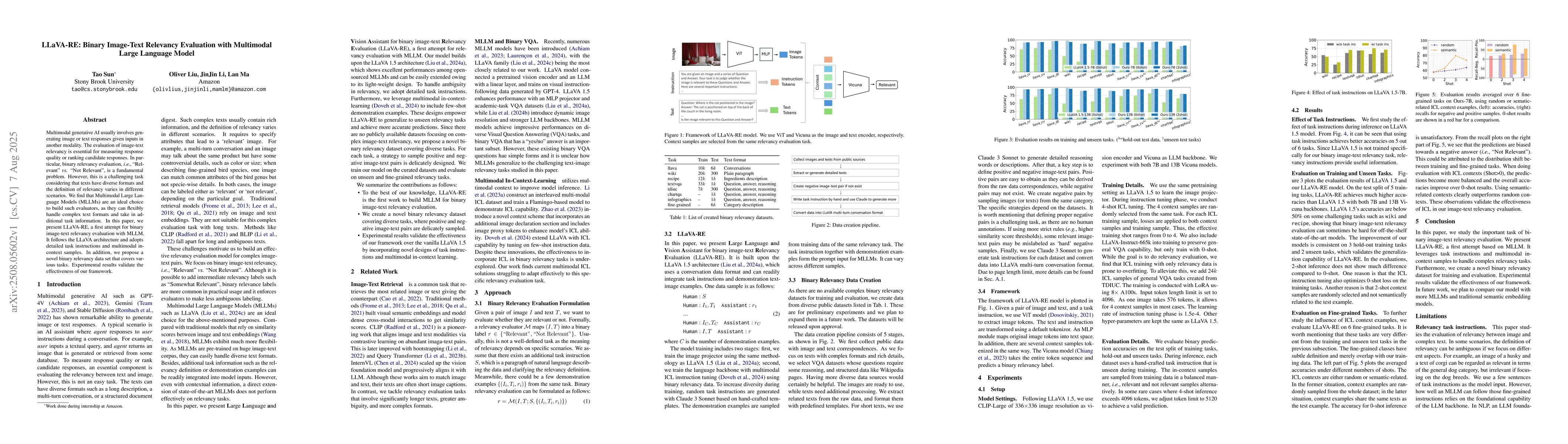 Multimodal generative AI usually involves generating image or text responses given inputs in another modality. The evaluation of image-text relevancy is essential for measuring response quality or ranking candidate responses. In particular, binary relevancy evaluation, i.e., ``Relevant'' vs. ``Not Relevant'', is a fundamental problem. However, this is a challenging task considering that texts have diverse formats and the definition of relevancy varies in different scenarios. We find that Multimodal Large Language Models (MLLMs) are an ideal choice to build such evaluators, as they can flexibly handle complex text formats and take in additional task information. In this paper, we present LLaVA-RE, a first attempt for binary image-text relevancy evaluation with MLLM. It follows the LLaVA architecture and adopts detailed task instructions and multimodal in-context samples. In addition, we propose a novel binary relevancy data set that covers various tasks. Experimental results validate the effectiveness of our framework.