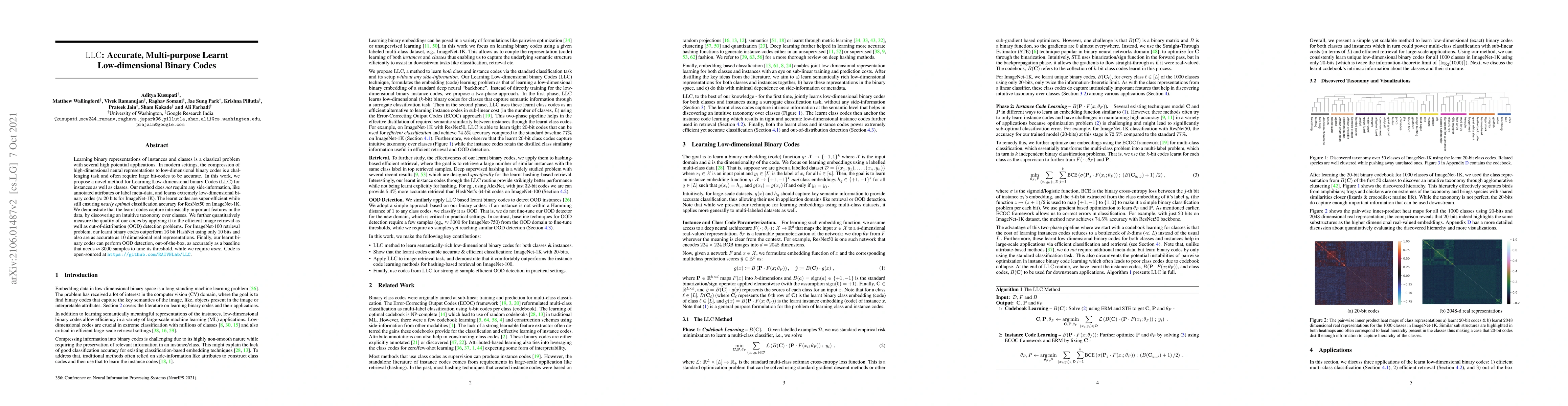 This paper proposes a novel method for Learning Low-dimensional binary Codes (LLC) that efficiently compresses high-dimensional neural representations into extremely low-dimensional binary codes (~20 bits). The method achieves nearly optimal classification accuracy and outperforms existing methods in image retrieval and out-of-distribution detection with minimal tuning.