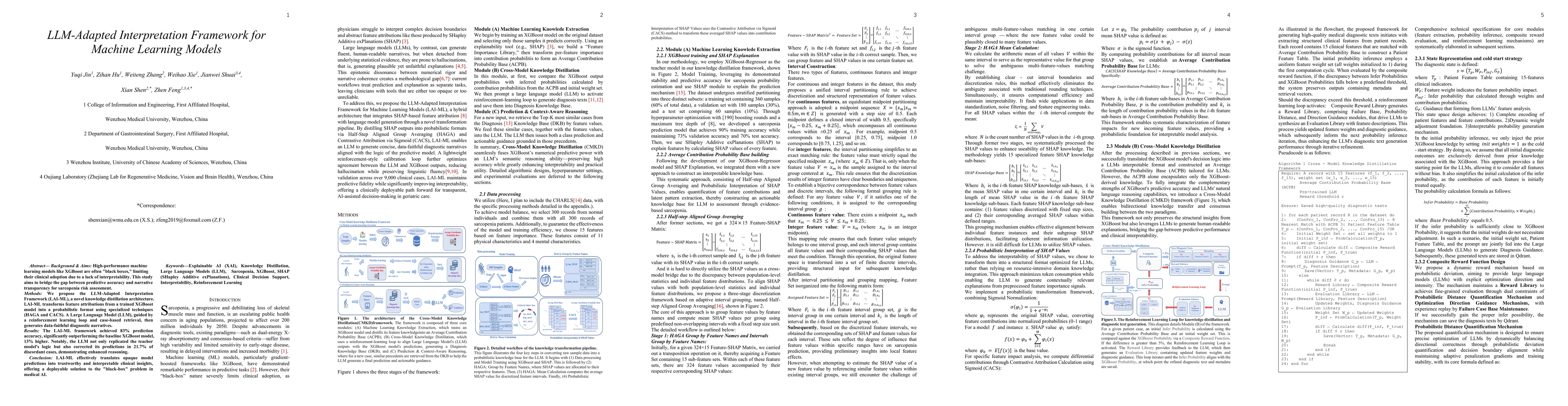 Background & Aims: High-performance machine learning models like XGBoost are often "black boxes," limiting their clinical adoption due to a lack of interpretability. This study aims to bridge the gap between predictive accuracy and narrative transparency for sarcopenia risk assessment. Methods: We propose the LLM-Adapted Interpretation Framework (LAI-ML), a novel knowledge distillation architecture. LAI-ML transforms feature attributions from a trained XGBoost model into a probabilistic format using specialized techniques (HAGA and CACS). A Large Language Model (LLM), guided by a reinforcement learning loop and case-based retrieval, then generates data-faithful diagnostic narratives. Results: The LAI-ML framework achieved 83% prediction accuracy, significantly outperforming the baseline XGBoost model, 13% higher. Notably, the LLM not only replicated the teacher model's logic but also corrected its predictions in 21.7% of discordant cases, demonstrating enhanced reasoning. Conclusion: LAI-ML effectively translates opaque model predictions into trustworthy and interpretable clinical insights, offering a deployable solution to the "black-box" problem in medical AI.