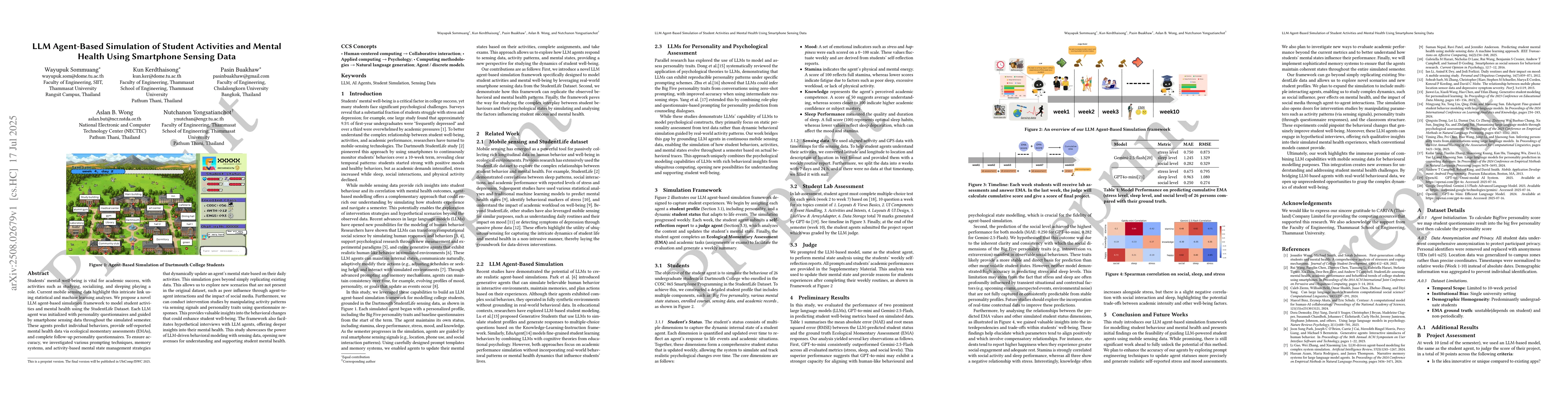 Students' mental well-being is vital for academic success, with activities such as studying, socializing, and sleeping playing a role. Current mobile sensing data highlight this intricate link using statistical and machine learning analyses. We propose a novel LLM agent-based simulation framework to model student activities and mental health using the StudentLife Dataset. Each LLM agent was initialized with personality questionnaires and guided by smartphone sensing data throughout the simulated semester. These agents predict individual behaviors, provide self-reported mental health data via ecological momentary assessments (EMAs), and complete follow-up personality questionnaires. To ensure accuracy, we investigated various prompting techniques, memory systems, and activity-based mental state management strategies that dynamically update an agent's mental state based on their daily activities. This simulation goes beyond simply replicating existing data. This allows us to explore new scenarios that are not present in the original dataset, such as peer influence through agent-to-agent interactions and the impact of social media. Furthermore, we can conduct intervention studies by manipulating activity patterns via sensing signals and personality traits using questionnaire responses. This provides valuable insights into the behavioral changes that could enhance student well-being. The framework also facilitates hypothetical interviews with LLM agents, offering deeper insights into their mental health. This study showcases the power of LLM-driven behavioral modeling with sensing data, opening new avenues for understanding and supporting student mental health.