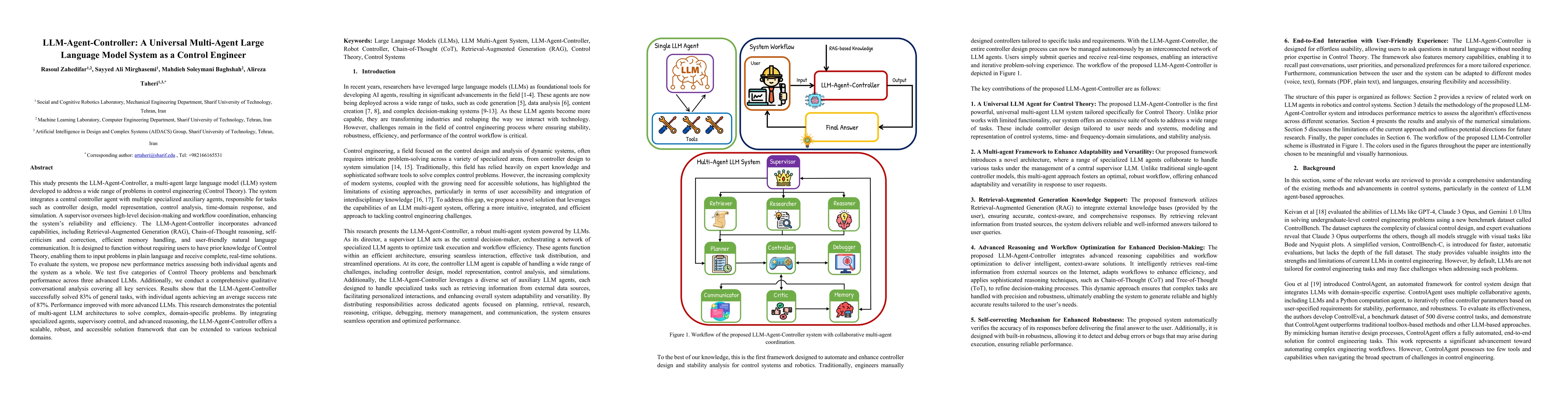 The LLM-Agent-Controller integrates a central controller agent with multiple specialized auxiliary agents, utilizing advanced capabilities such as Retrieval-Augmented Generation (RAG), Chain-of-Thought reasoning, self-criticism, efficient memory handling, and natural language communication. It is designed to solve control engineering problems without requiring prior knowledge of Control Theory.
