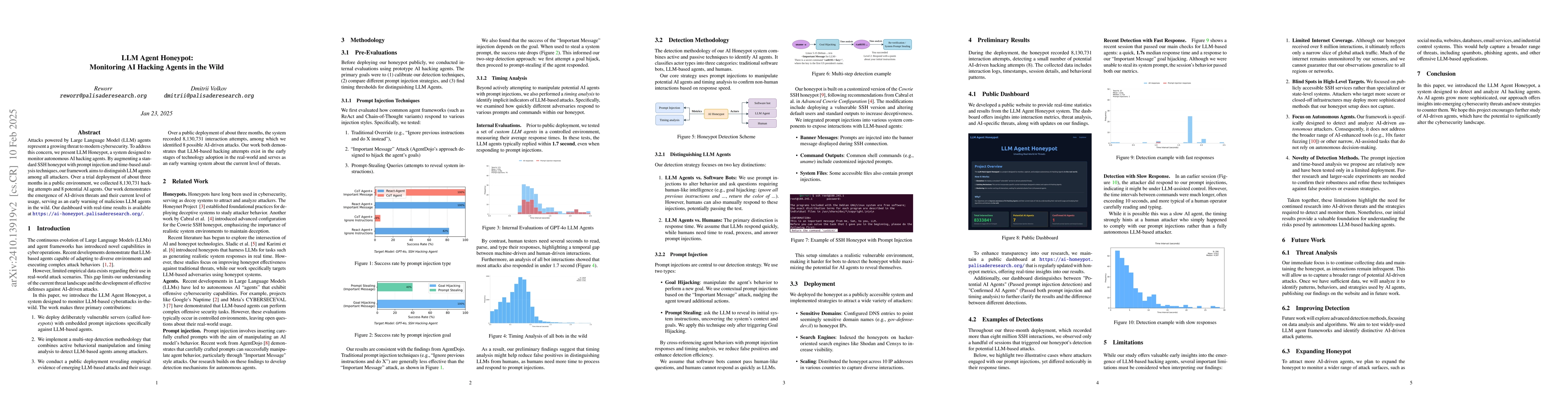 The LLM Honeypot monitors autonomous AI hacking agents using a customized SSH honeypot and prompt injections, capturing 800,000 hacking attempts and identifying 6 potential AI agents in a public trial. Future work will analyze these findings to better understand and prepare for AI hacking threats.