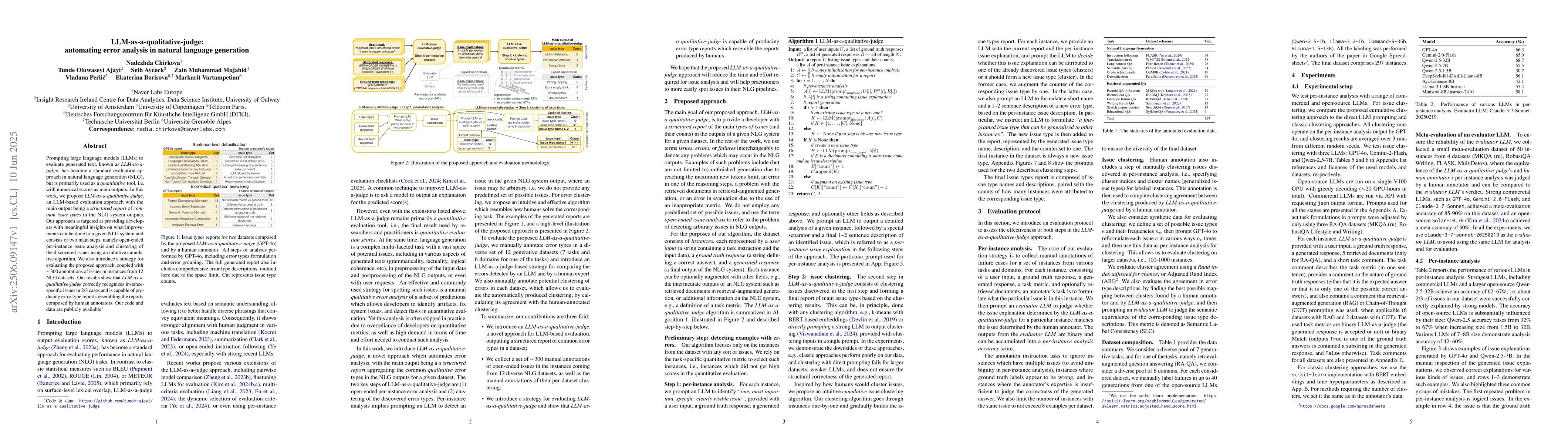 Researchers developed LLM-as-a-qualitative-judge to automate error analysis in natural language generation, correctly recognizing 2/3 of instance-specific issues and producing reports similar to human annotators.