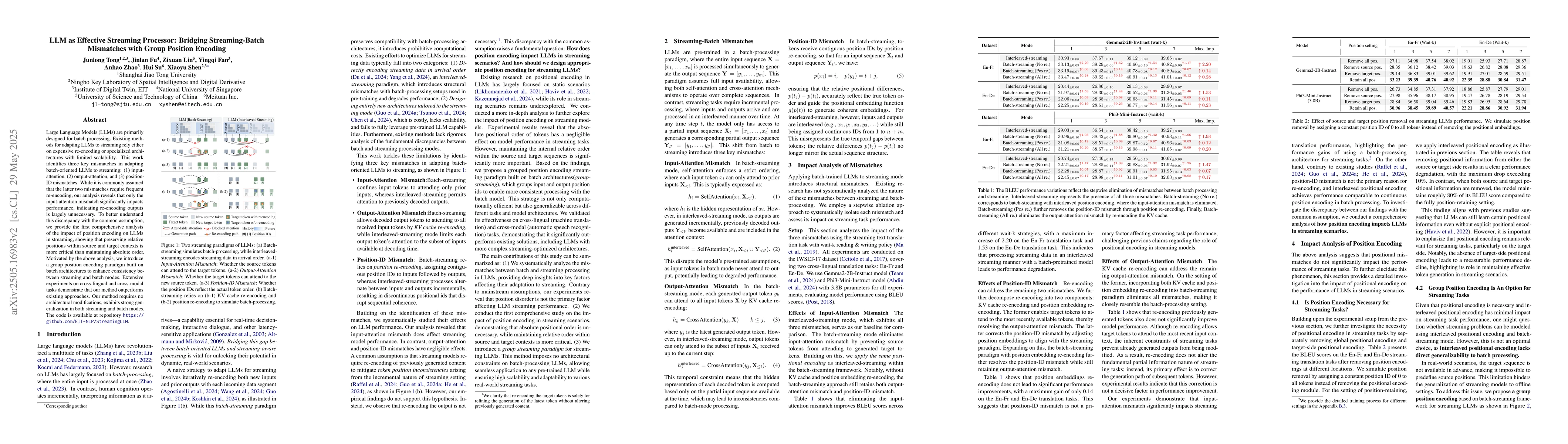 The paper identifies three key mismatches in adapting batch-oriented LLMs to streaming: input-attention, output-attention, and position-ID mismatches. It provides a comprehensive analysis of the impact of position encoding on LLMs in streaming, revealing that relative positions within contexts are more critical than absolute order. Based on this, a group position encoding paradigm is introduced to enhance consistency between streaming and batch modes.