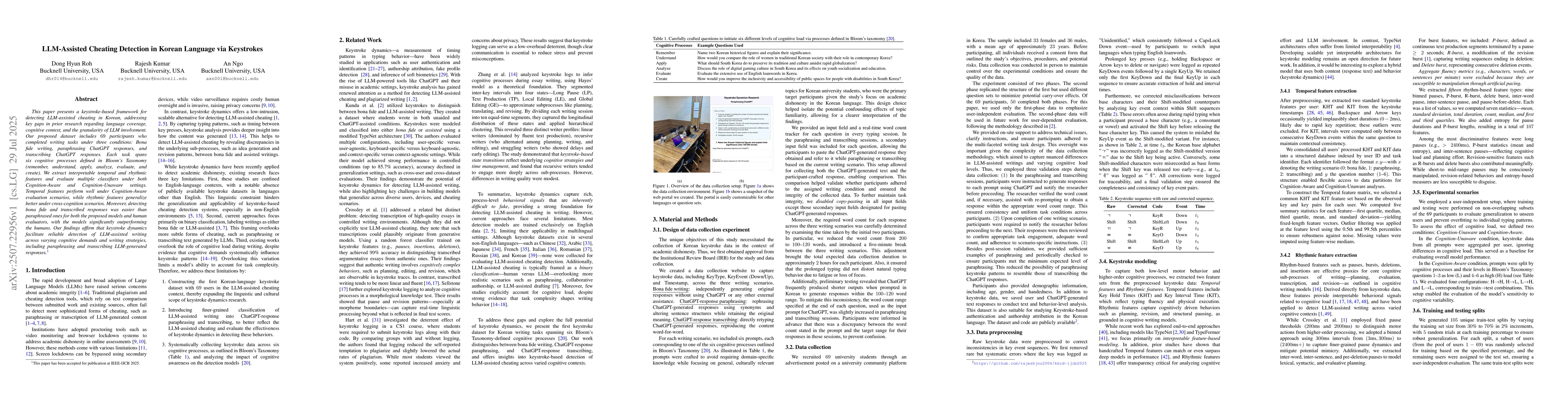 The study employs a keystroke-based framework to detect LLM-assisted cheating in Korean, utilizing a dataset of 69 participants completing writing tasks under bona fide, paraphrasing ChatGPT responses, and transcribing ChatGPT responses. Temporal and rhythmic features are extracted and evaluated using classifiers under Cognition-Aware and Cognition-Unaware settings.