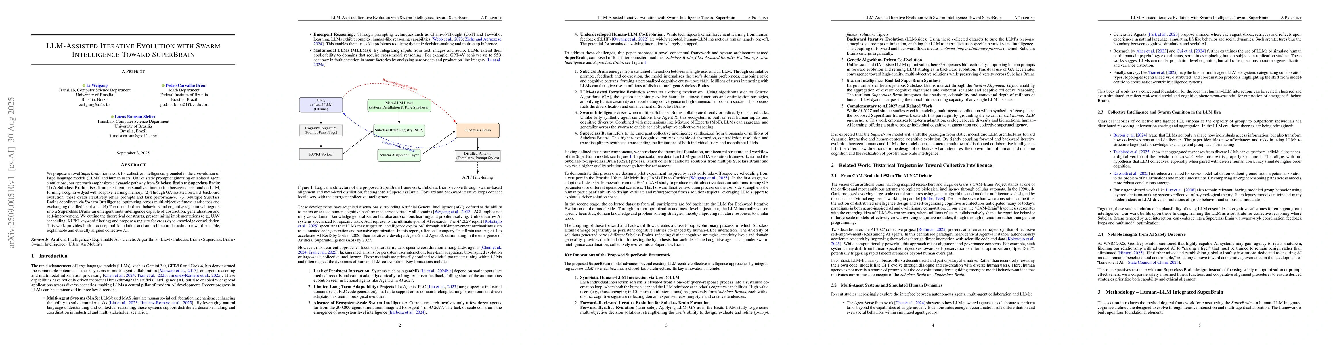 We propose a novel SuperBrain framework for collective intelligence, grounded in the co-evolution of large language models (LLMs) and human users. Unlike static prompt engineering or isolated agent simulations, our approach emphasizes a dynamic pathway from Subclass Brain to Superclass Brain: (1) A Subclass Brain arises from persistent, personalized interaction between a user and an LLM, forming a cognitive dyad with adaptive learning memory. (2) Through GA-assisted forward-backward evolution, these dyads iteratively refine prompts and task performance. (3) Multiple Subclass Brains coordinate via Swarm Intelligence, optimizing across multi-objective fitness landscapes and exchanging distilled heuristics. (4) Their standardized behaviors and cognitive signatures integrate into a Superclass Brain, an emergent meta-intelligence capable of abstraction, generalization and self-improvement. We outline the theoretical constructs, present initial implementations (e.g., UAV scheduling, KU/KI keyword filtering) and propose a registry for cross-dyad knowledge consolidation. This work provides both a conceptual foundation and an architectural roadmap toward scalable, explainable and ethically aligned collective AI.
