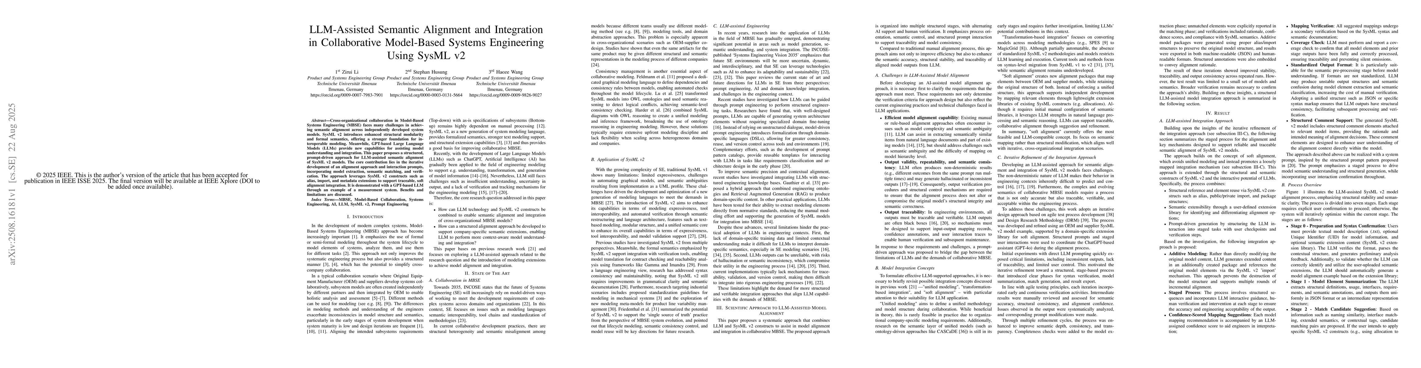Cross-organizational collaboration in Model-Based Systems Engineering (MBSE) faces many challenges in achieving semantic alignment across independently developed system models. SysML v2 introduces enhanced structural modularity and formal semantics, offering a stronger foundation for interoperable modeling. Meanwhile, GPT-based Large Language Models (LLMs) provide new capabilities for assisting model understanding and integration. This paper proposes a structured, prompt-driven approach for LLM-assisted semantic alignment of SysML v2 models. The core contribution lies in the iterative development of an alignment approach and interaction prompts, incorporating model extraction, semantic matching, and verification. The approach leverages SysML v2 constructs such as alias, import, and metadata extensions to support traceable, soft alignment integration. It is demonstrated with a GPT-based LLM through an example of a measurement system. Benefits and limitations are discussed.