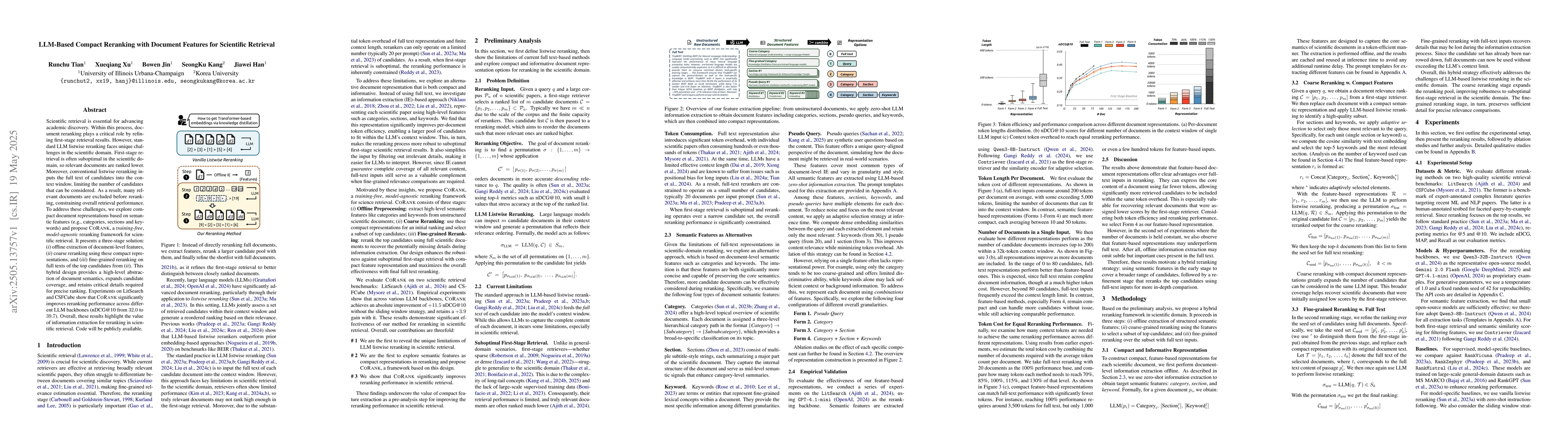 Scientific retrieval is essential for advancing academic discovery. Within this process, document reranking plays a critical role by refining first-stage retrieval results. However, large language model (LLM) listwise reranking faces unique challenges in the scientific domain. First-stage retrieval is often suboptimal in the scientific domain, so relevant documents are ranked lower. Moreover, conventional listwise reranking uses the full text of candidate documents in the context window, limiting the number of candidates that can be considered. As a result, many relevant documents are excluded before reranking, which constrains overall retrieval performance. To address these challenges, we explore compact document representations based on semantic features such as categories, sections, and keywords, and propose a training-free, model-agnostic reranking framework for scientific retrieval called CoRank. The framework involves three stages: (i) offline extraction of document-level features, (ii) coarse reranking using these compact representations, and (iii) fine-grained reranking on full texts of the top candidates from stage (ii). This hybrid design provides a high-level abstraction of document semantics, expands candidate coverage, and retains critical details required for precise ranking. Experiments on LitSearch and CSFCube show that CoRank significantly improves reranking performance across different LLM backbones, increasing nDCG@10 from 32.0 to 39.7. Overall, these results highlight the value of information extraction for reranking in scientific retrieval.