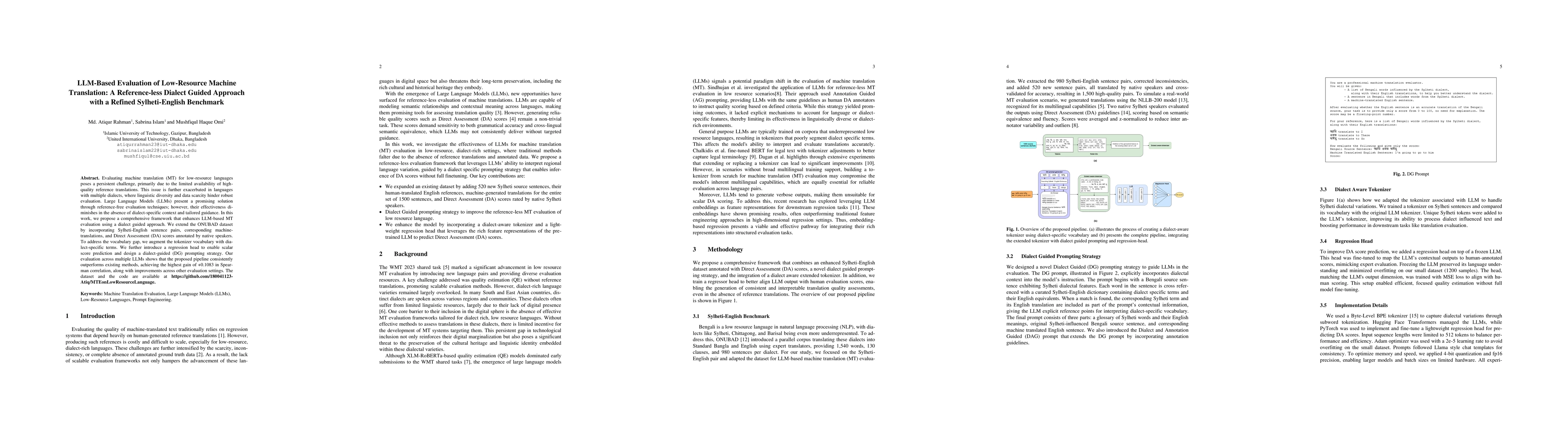 The research proposes a dialect-guided framework for enhancing LLM-based MT evaluation in low-resource languages, using an extended ONUBAD dataset with Sylheti-English sentence pairs, DA scores, and dialect-specific vocabulary augmentation.