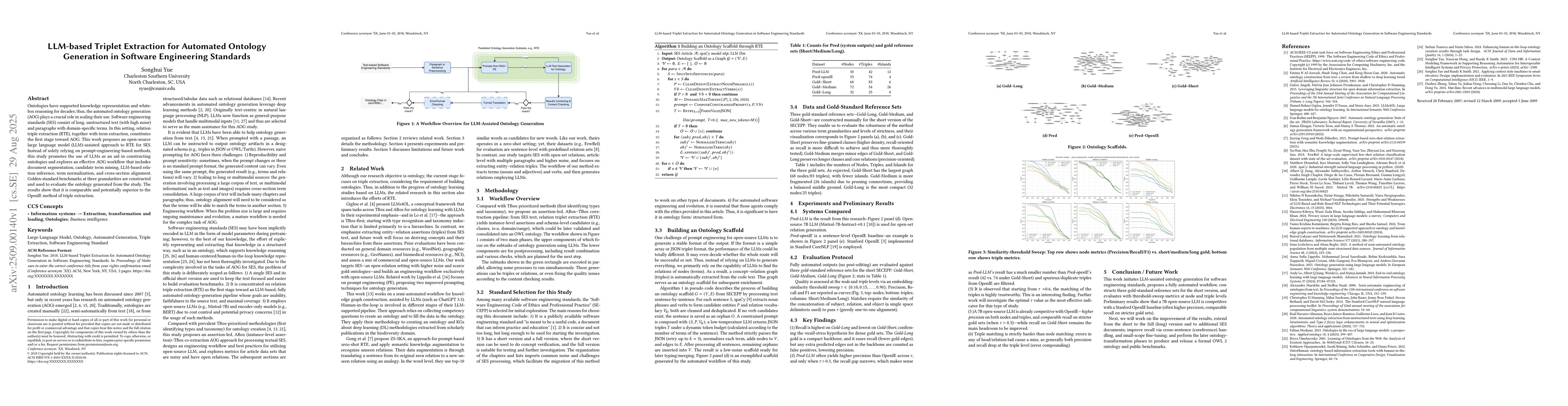 Ontologies have supported knowledge representation and whitebox reasoning for decades; thus, the automated ontology generation (AOG) plays a crucial role in scaling their use. Software engineering standards (SES) consist of long, unstructured text (with high noise) and paragraphs with domain-specific terms. In this setting, relation triple extraction (RTE), together with term extraction, constitutes the first stage toward AOG. This work proposes an open-source large language model (LLM)-assisted approach to RTE for SES. Instead of solely relying on prompt-engineering-based methods, this study promotes the use of LLMs as an aid in constructing ontologies and explores an effective AOG workflow that includes document segmentation, candidate term mining, LLM-based relation inference, term normalization, and cross-section alignment. Golden-standard benchmarks at three granularities are constructed and used to evaluate the ontology generated from the study. The results show that it is comparable and potentially superior to the OpenIE method of triple extraction.