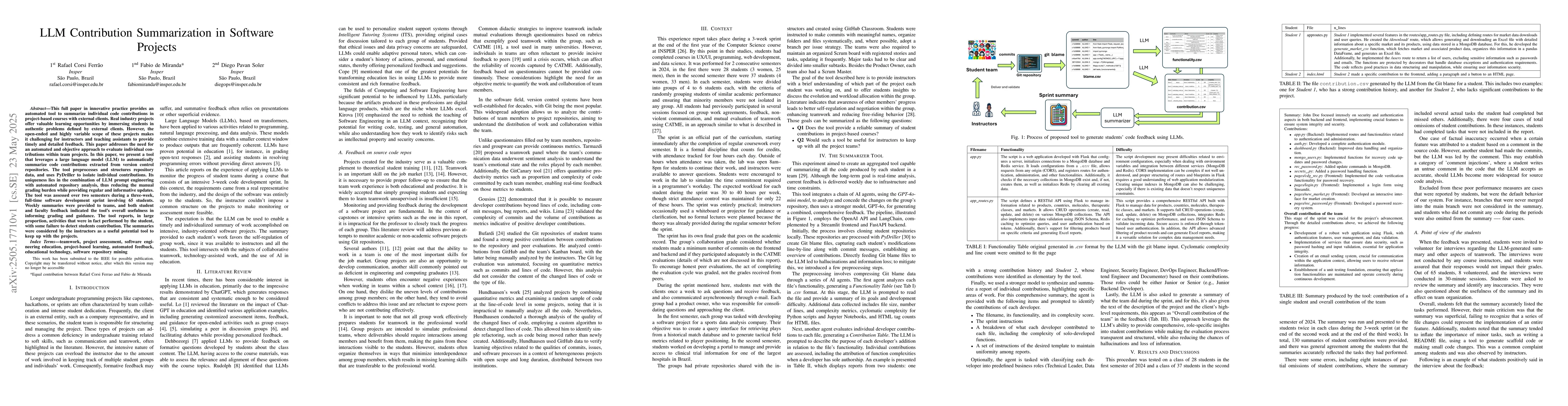 This work stands out by uniquely integrating large language models with automated repository analysis for contribution summarization, offering a solution tailored to project-based software learning environments.