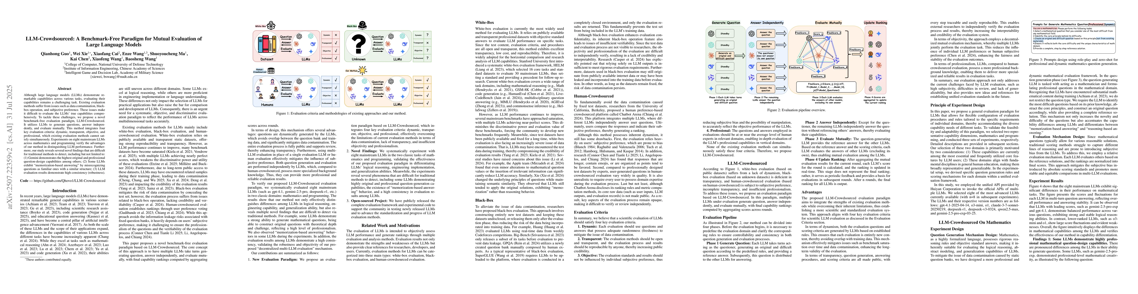 The research proposes LLM-Crowdsourced, a benchmark-free evaluation paradigm for large language models (LLMs) that utilizes LLMs to generate questions, answer independently, and evaluate mutually. This method integrates four key evaluation criteria: dynamic, transparent, objective, and professional.
