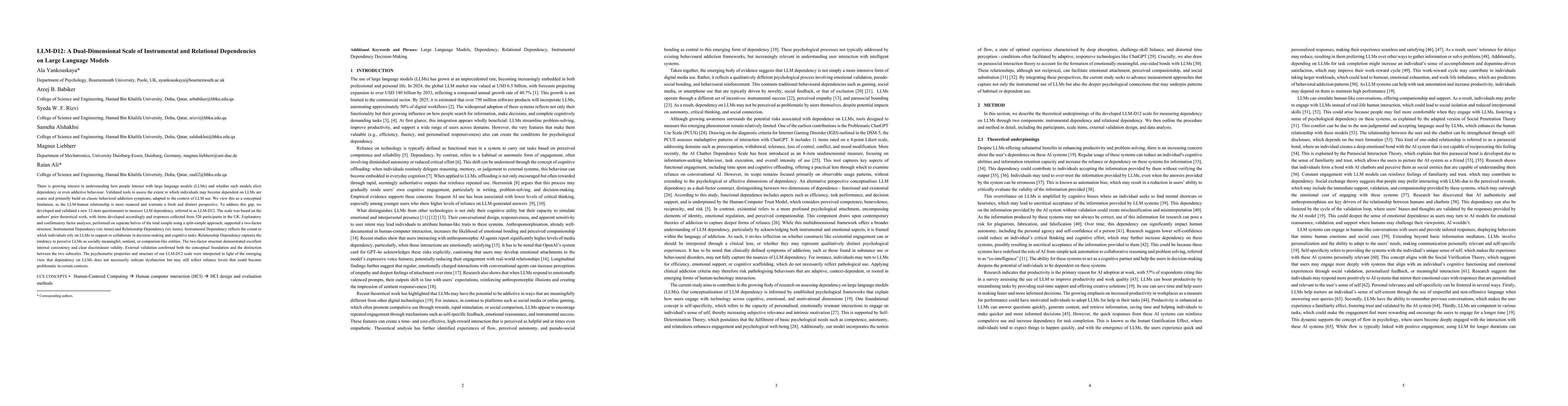 The research methodology involved developing and validating a 12-item questionnaire, LLM-D12, to measure Instrumental and Relational Dependencies on Large Language Models (LLMs). The scale was based on exploratory and confirmatory factor analyses, with items collected from 526 UK participants. The scale demonstrated a two-factor structure: Instrumental Dependency (6 items) and Relationship Dependency (6 items).